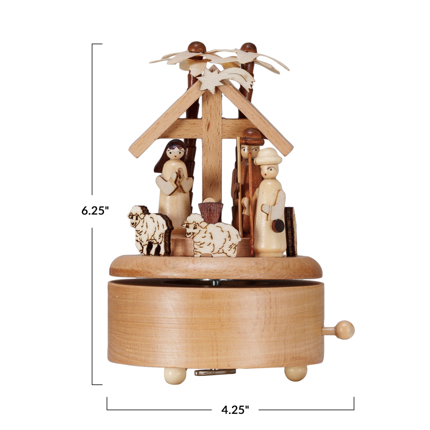 Catalog Name: 4-1/4" Round x 6-1/4"H Wood Wind-Up Nativity Music Box, Plays "Oh Christmas Tree" (Requires 2-AA Batteries)