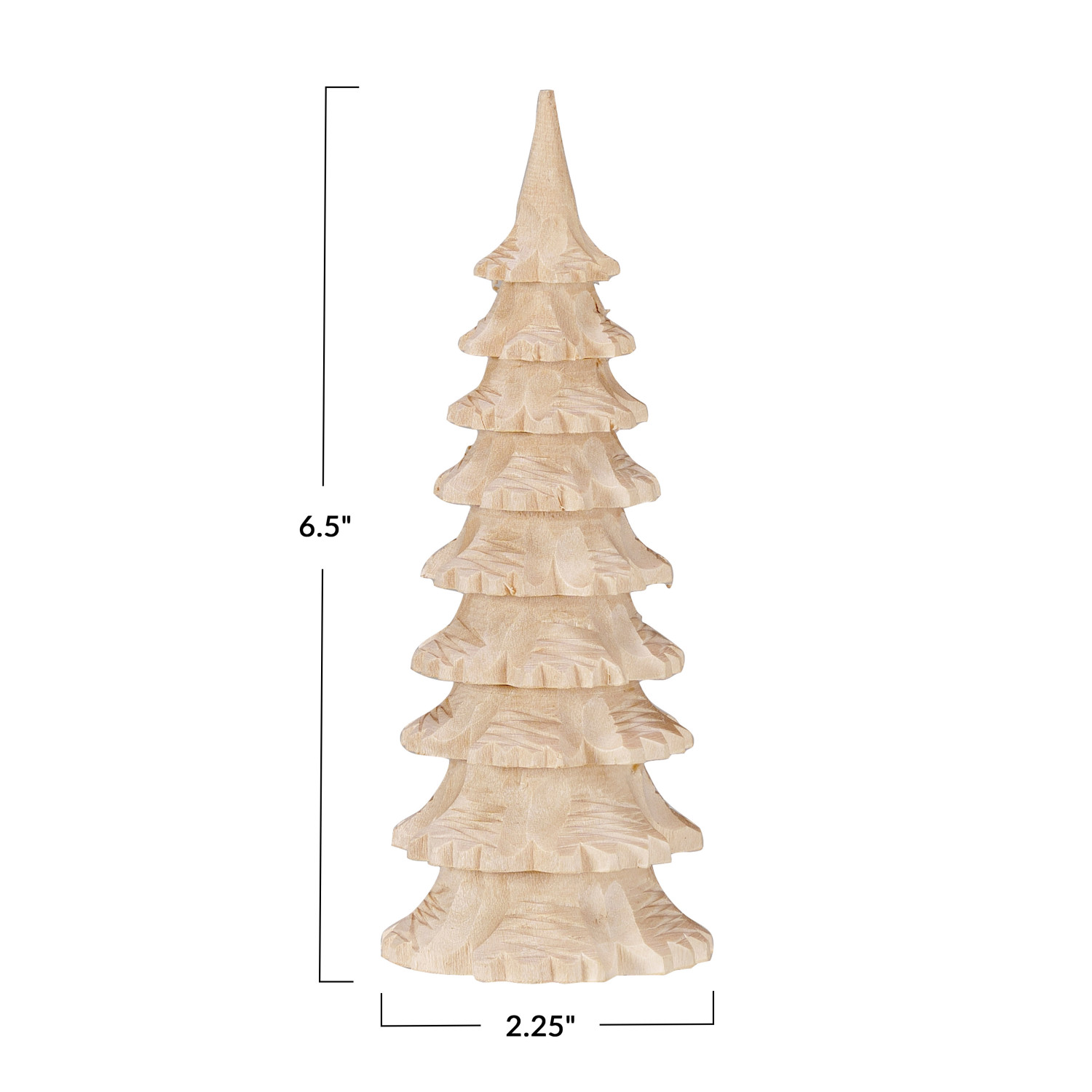 This natural, carved wood tree is a beautiful and convenient way to decorate for the holidays. It features a carved wood tree with a natural color and a cone shape that creates a rustic and authentic effect, making it look like a real tree. The tree has a solid and textured texture that is pleasant to touch and look at. The tree is ideal for displaying on a table, shelf, or mantel, where it can add a touch of nature and tradition to the space. The tree is made of solid, durable, and natural basswood, making it a great choice for holiday decoration. It measures 2.25 inches in diameter and 6.5 inches in height, making it a noticeable and attractive centerpiece. Elevate the holiday decor with this eye-catching Christmas tree, adding both style and a touch of whimsy. A carved wood tree with a natural color and a cone shape that creates a rustic and authentic effect. A classic and timeless addition to the holiday decor, this tree adds a touch of nature and tradition to any space. Ideal for displaying on a table, shelf, or mantel, this tree can be used as a standalone piece or paired with other items.