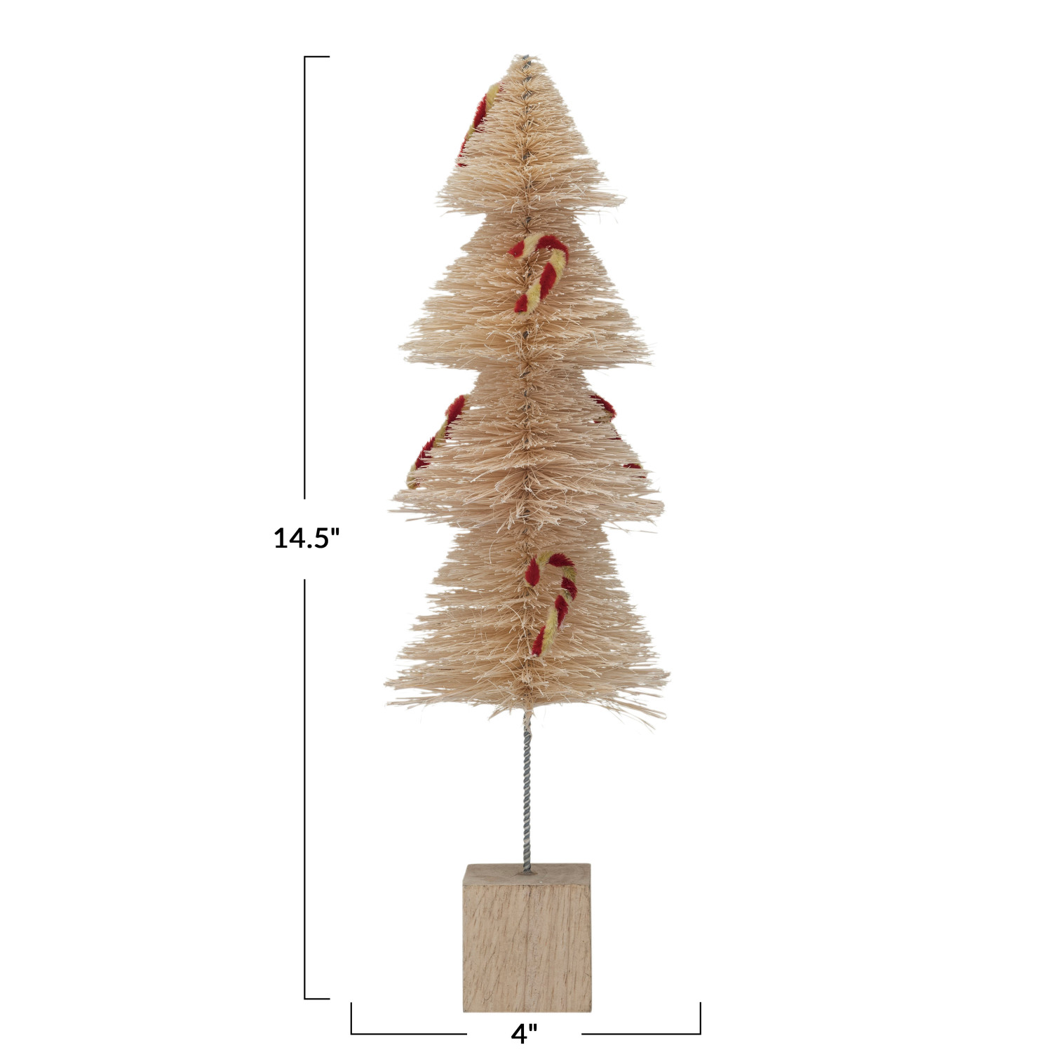 Catalog Name: 4" Round x 14-1/2"H Sisal Bottle Brush Tree w/ Chenille Candy Cane & Wood Base, Natural, White & Red