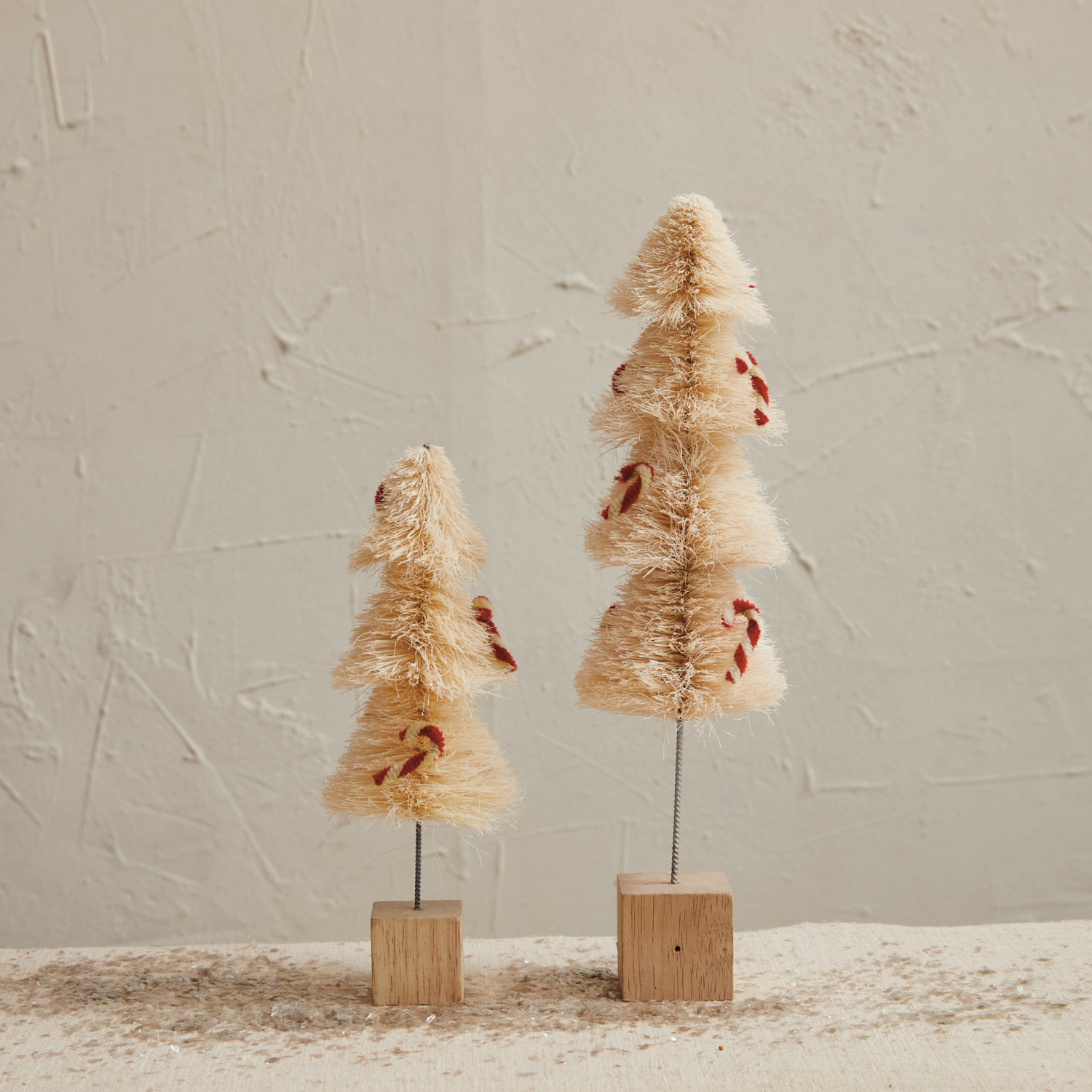 Catalog Name: 3-1/2" Round x 10"H Sisal Bottle Brush Tree w/ Chenille Candy Cane & Wood Base, Natural, White & Red