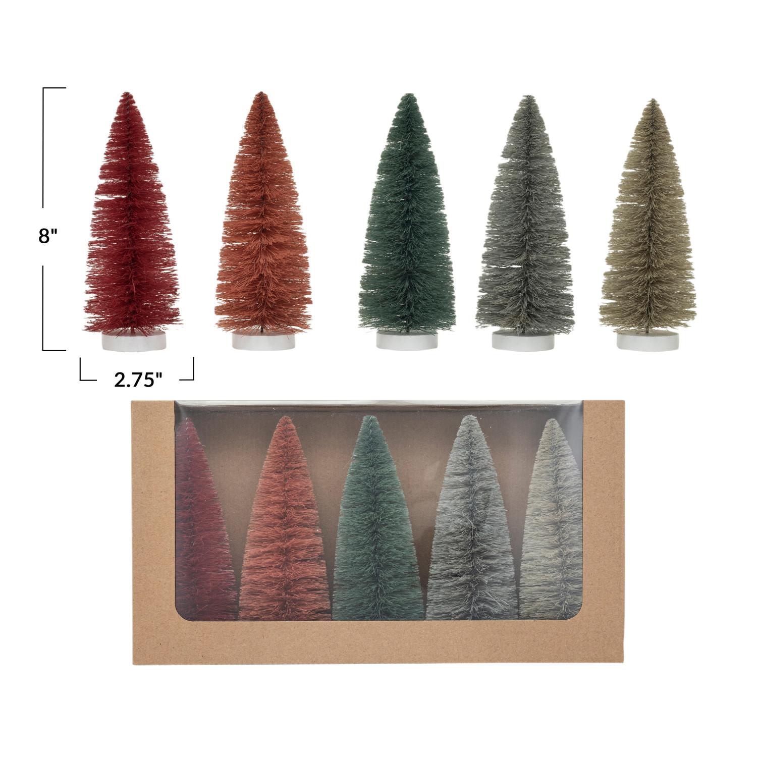Catalog Name: 2-3/4" Round x 8"H Sisal Bottle Brush Trees w/ Wood Bases, Multi Color, Boxed Set of 5