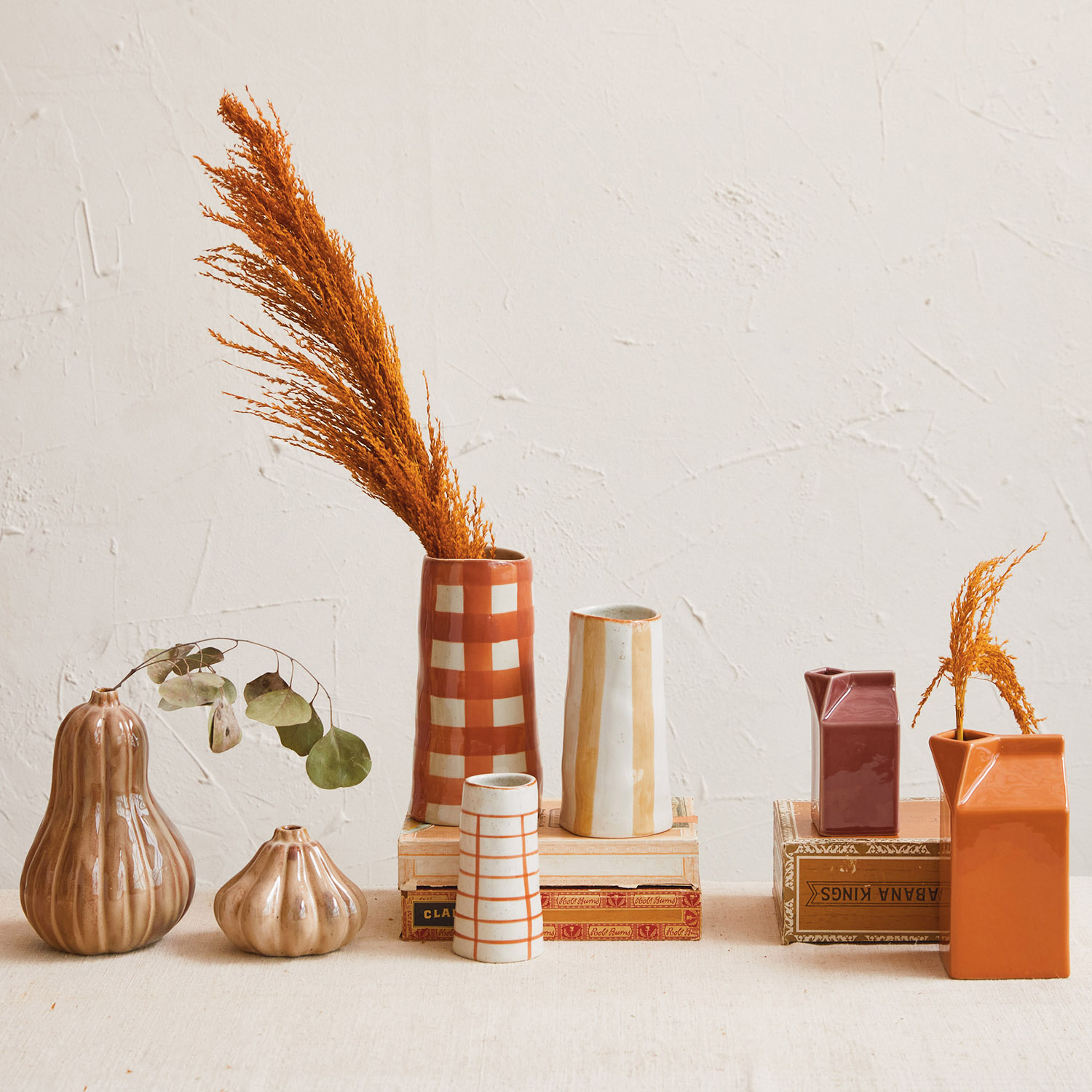 Catalog Name: 3-3/4"L x 3-1/4"W x 6-1/2"H Stoneware Milk Carton Vase, Reactive Glaze, Pumpkin Color (Each One Will Vary)