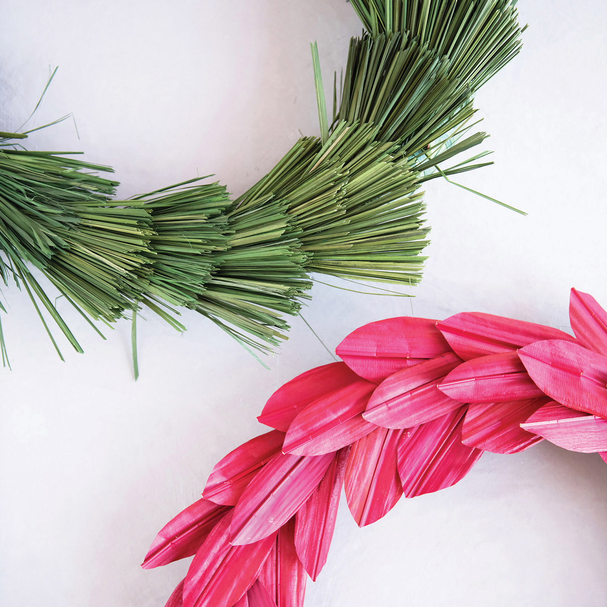 This wreath adds a bit of holiday decor to any door. Made out of Dried Buri Palm Leaves, this wreath effortlessly brings both boho and nature elements to any home. With a festive red color, this wreath will make a great first impression for anyone entering your home.