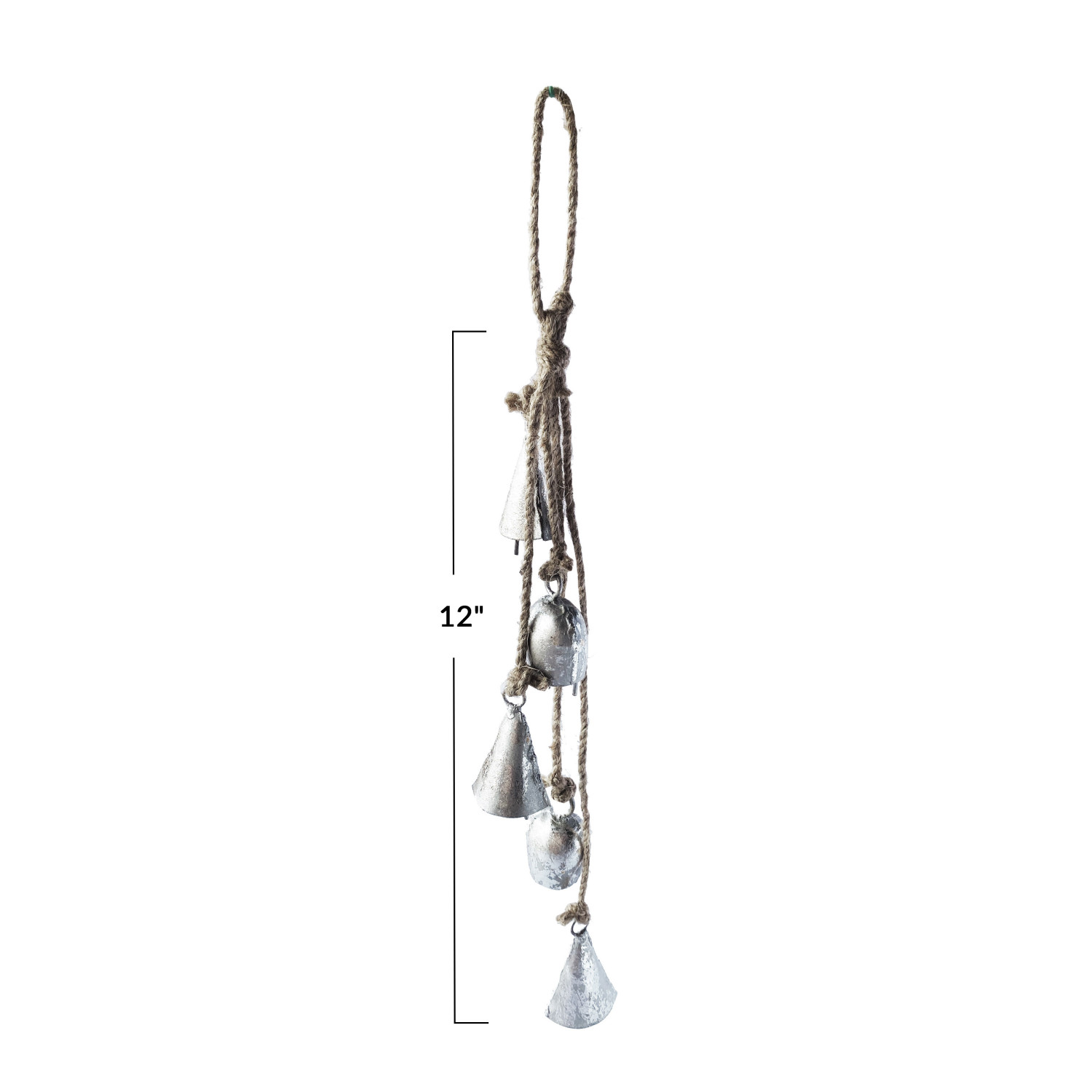 Catalog Name: 12"H Handmade Hanging Metal Bells w/ Jute Rope, Antique Silver Finish
