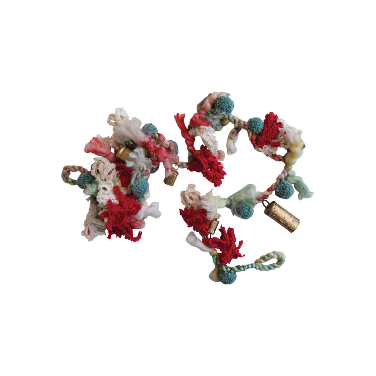 This handmade wool and cotton blend garland is a celebration of artisanal craftsmanship and vintage aesthetics. Each element, from the soft pom poms to the jingling metal bells, is a nod to the joyous moments of yesteryear. Stretching 72 inches in length and standing 4 inches high, the garland is a substantial piece that can be the focal point of the decor. Whether it's draped over a mantelpiece, along a staircase, or around a festive table, this garland is sure to add a sense of merriment and a dash of antique glamour to the space. It's a piece that beautifully blends the old with the new, creating a timeless decoration for any occasion. A vibrant garland adorned with fluffy pom poms and delicate metal bells, finished in an antique gold, creating a symphony of color and sound. An eclectic mix that brings a touch of whimsy and nostalgia to any decor, perfect for those who appreciate a fusion of textures and eras. Perfect for adding a playful yet elegant ambiance to parties, seasonal festivities, or as a unique everyday accent.