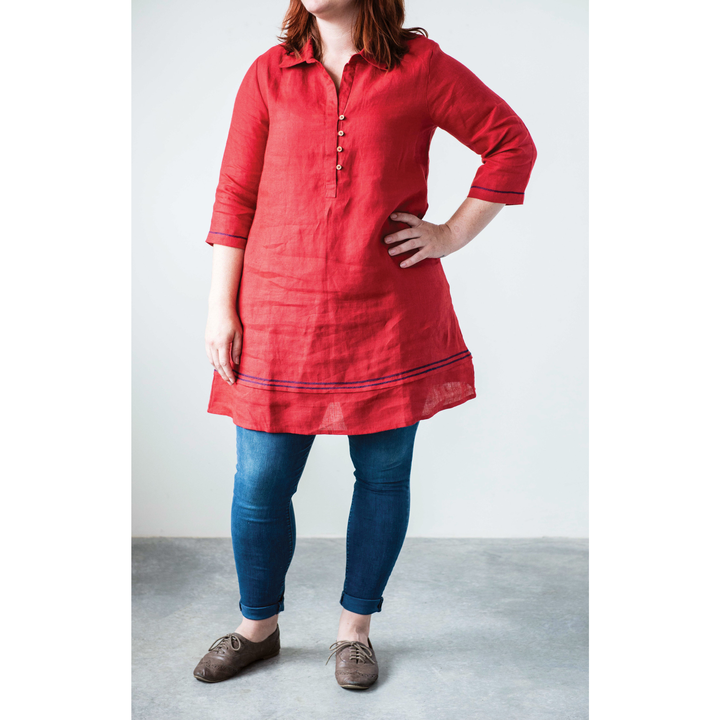 Catalog Name: Linen Kate Tunic, Red w/ Blue Stitch, Extra Small