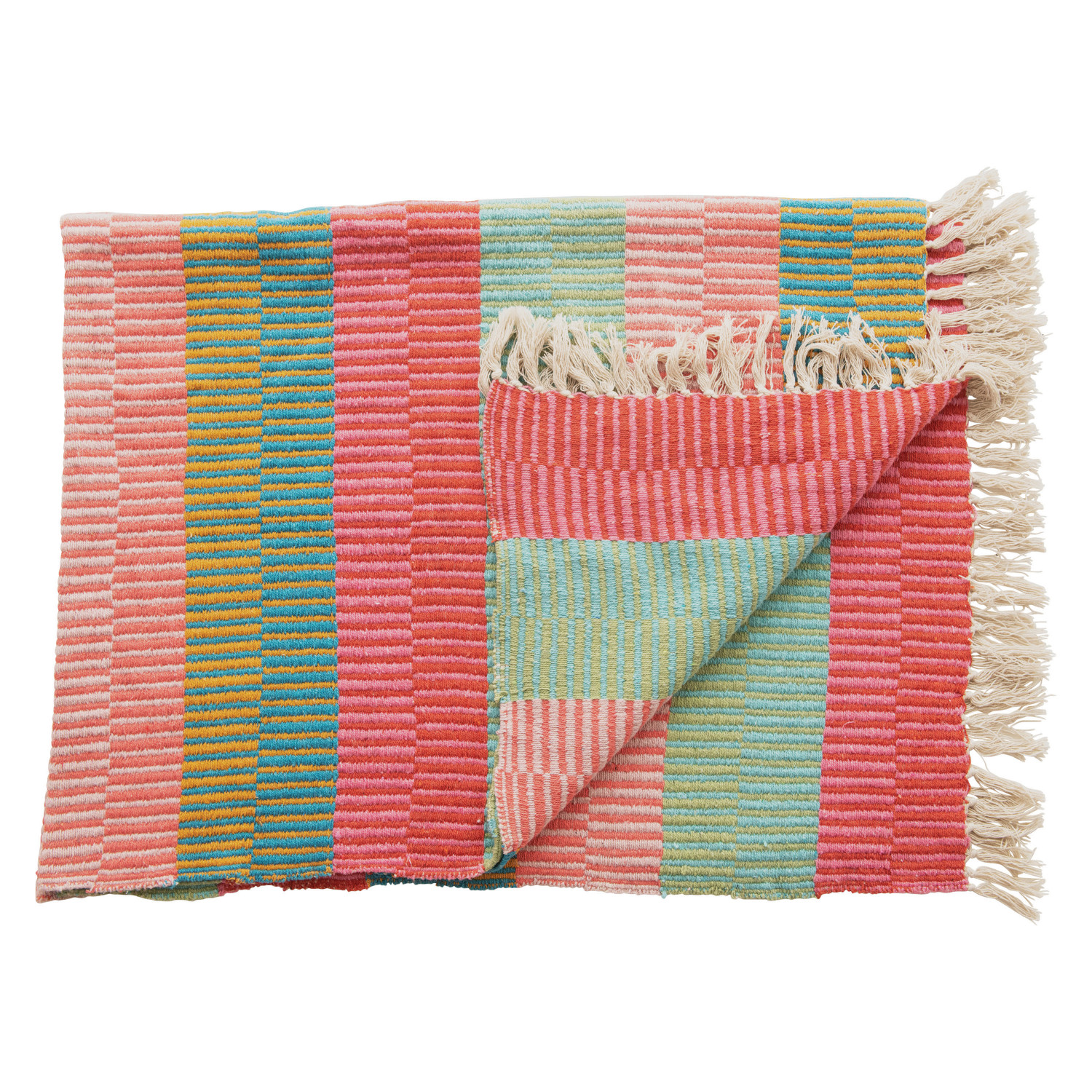 Catalog Name: 60"L x 50"W Woven Recycled Cotton Blend Throw w/ Stripes & Fringe, Multi Color