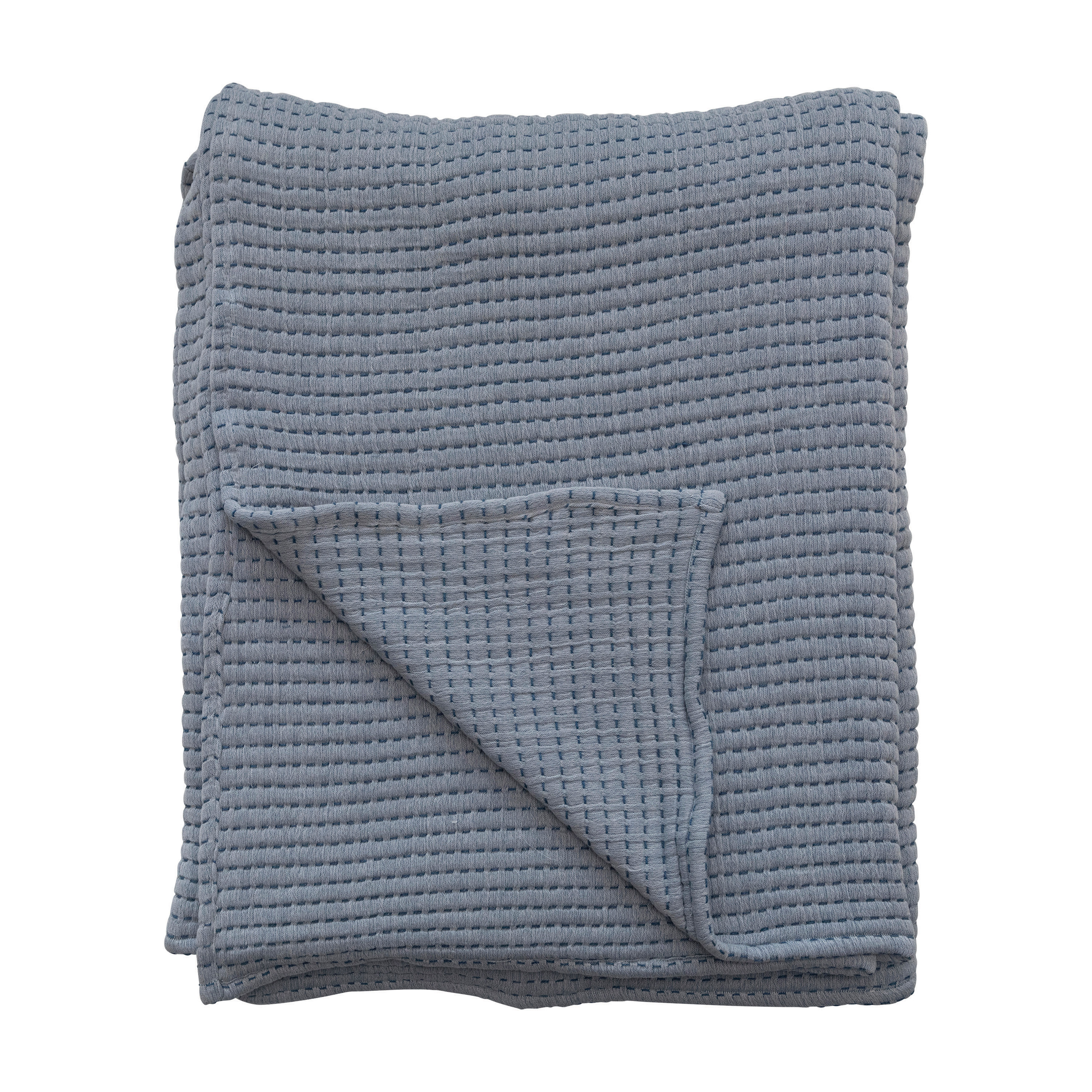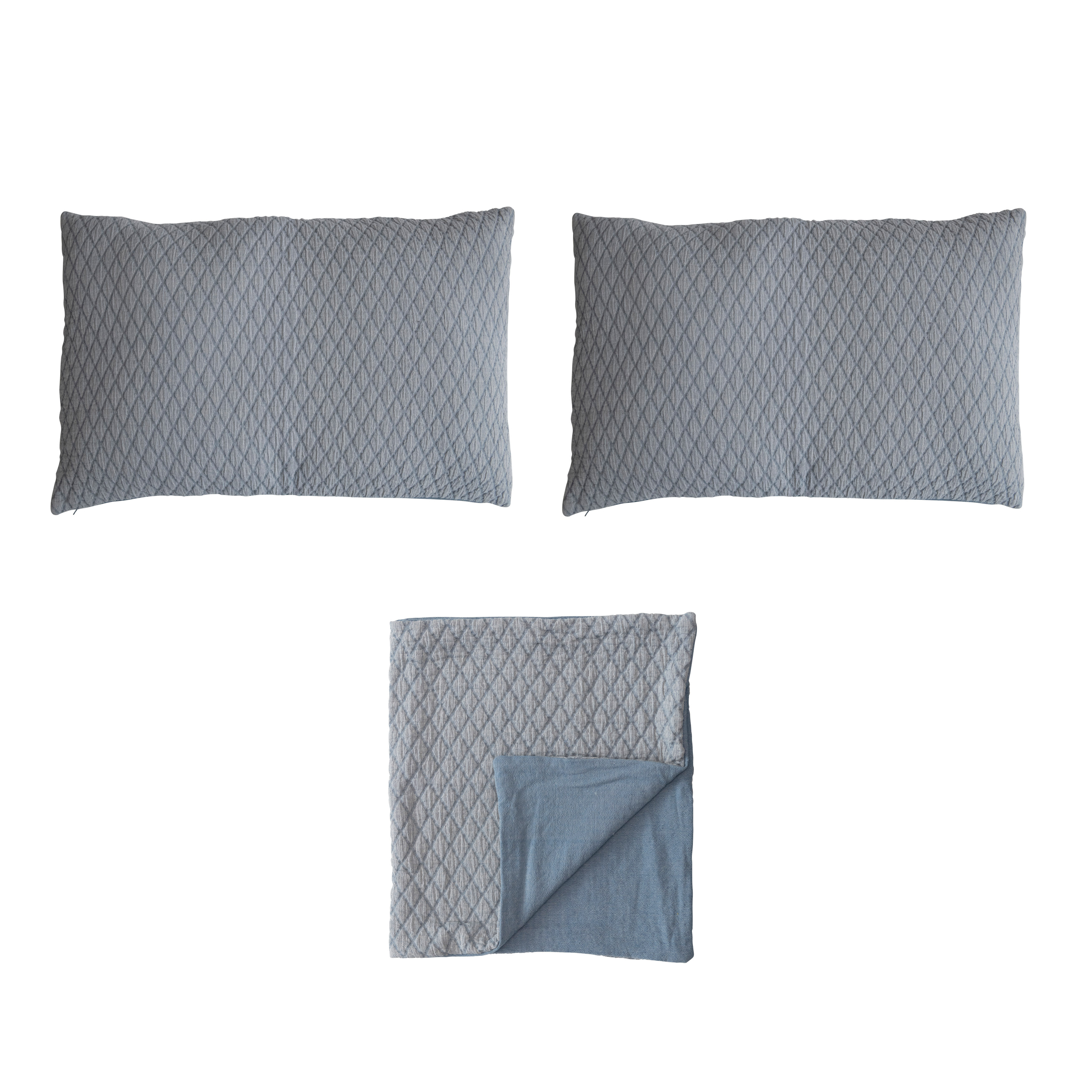 This serene cotton bedding set showcases supple woven cotton jacquard with a kantha stitch, and includes 2 quilted king shams and king-sized bed cover. Blue woven cotton jacquard king bedding set with quilted kantha stitch; Includes 2 king quilted shams and bed cover. Express your constantly evolving style with the simple addition of this eye-catching bedding set. King cotton jacquard bed set; Machine wash cold, gentle cycle, do not bleach, warm iron if needed.