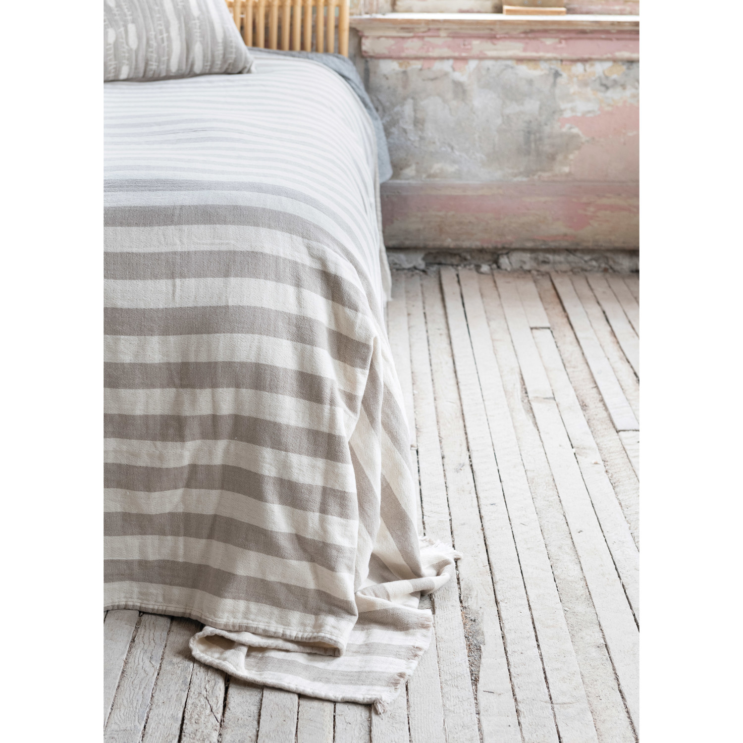 This elegant bed set showcases a luxurious striped cotton double cloth bed cover and matching shams with wood buttons. Machine Wash Warm, Gentle Cycle, Do Not Bleach, Tumble Dry Low, Warm Iron if Needed.