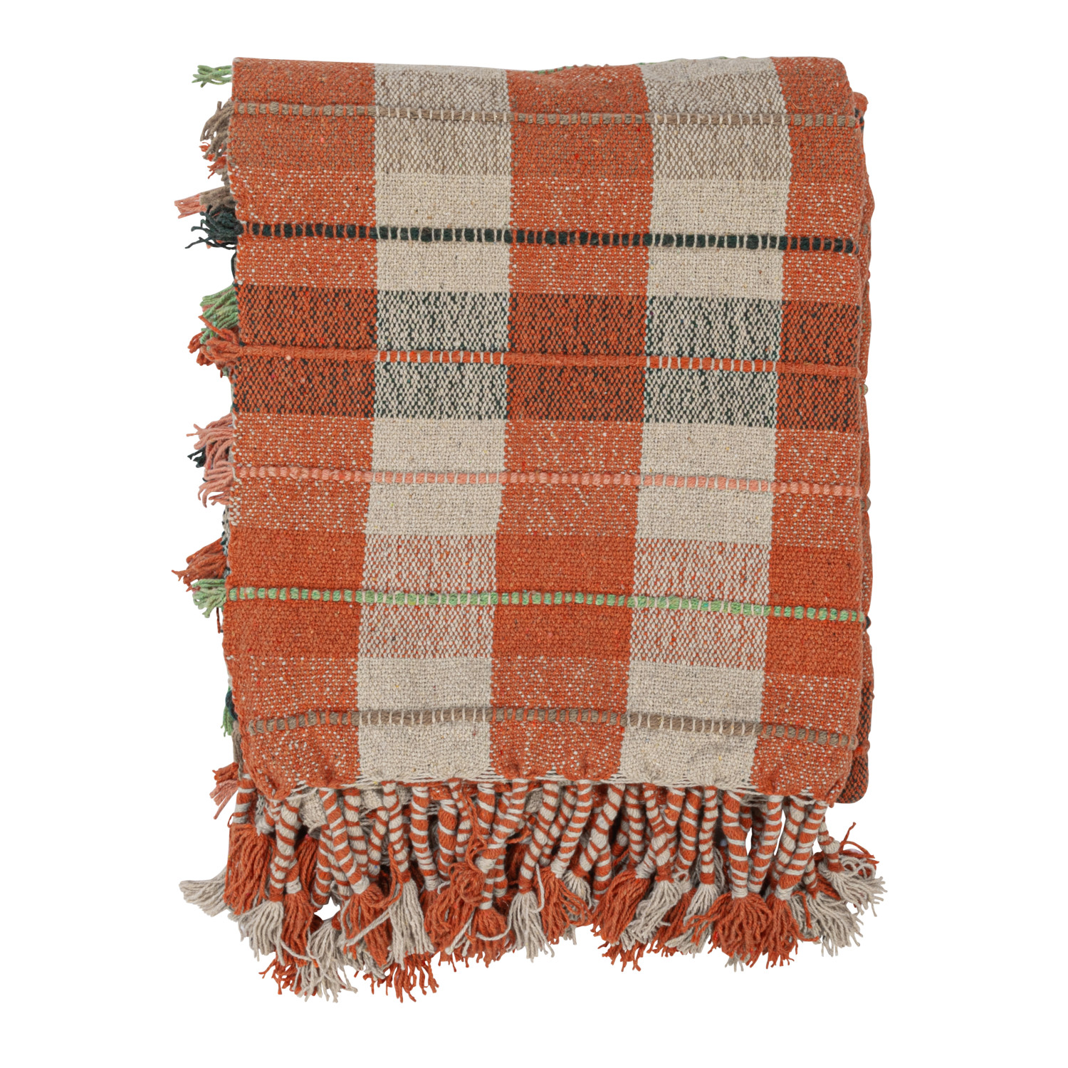 Catalog Name: 60"L x 50"W Woven Recycled Cotton Blend Throw w/ Plaid Pattern & Braided Fringe, Multi Color