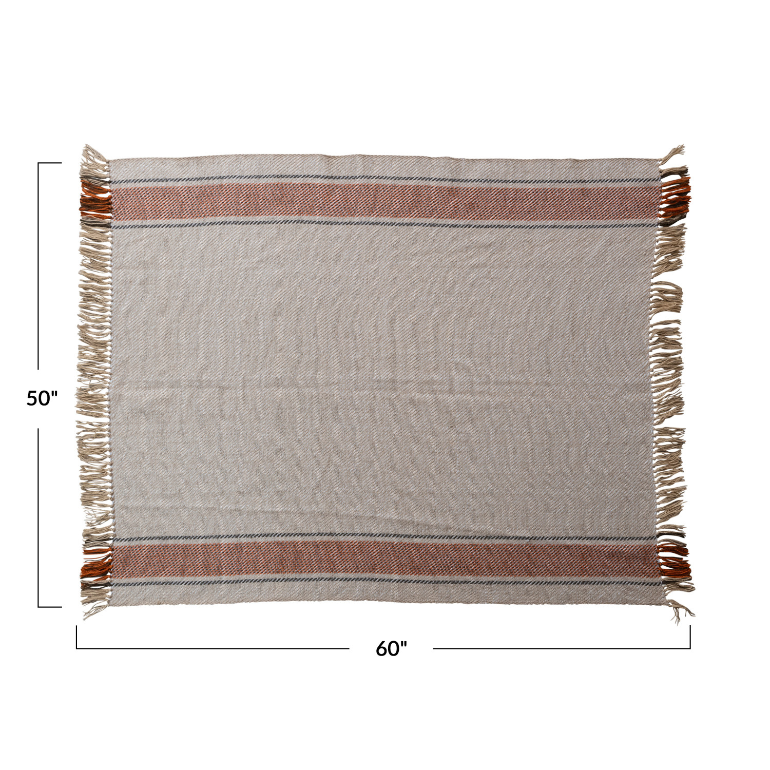 Catalog Name: 60"L x 50"W Hand-Woven Recycled PET Indoor/Outdoor Throw w/ Stripes & Fringe, Tan, Black & Orange Color