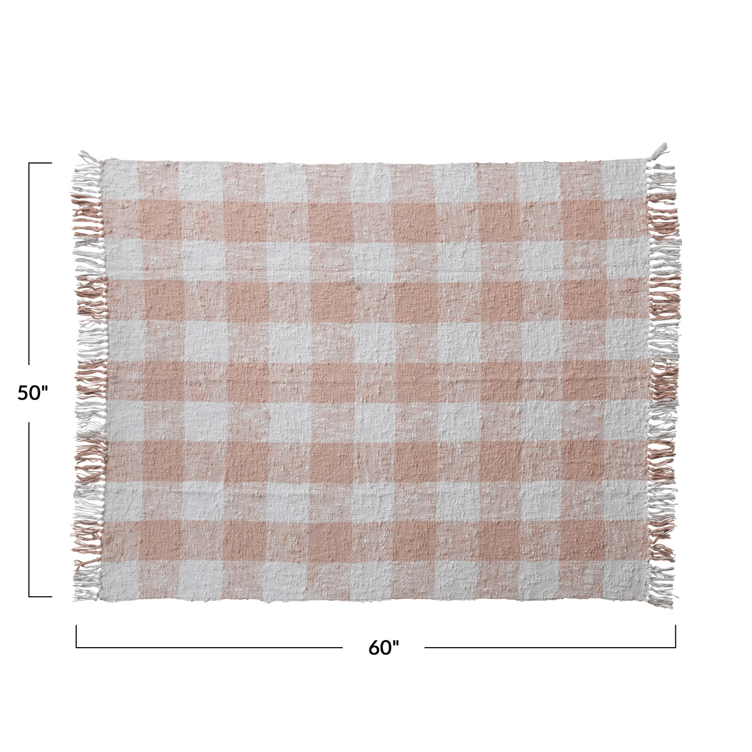 Catalog Name: 60"L x 50"W Hand-Woven Cotton Throw w/ Fringe, Blush & Cream Color Plaid