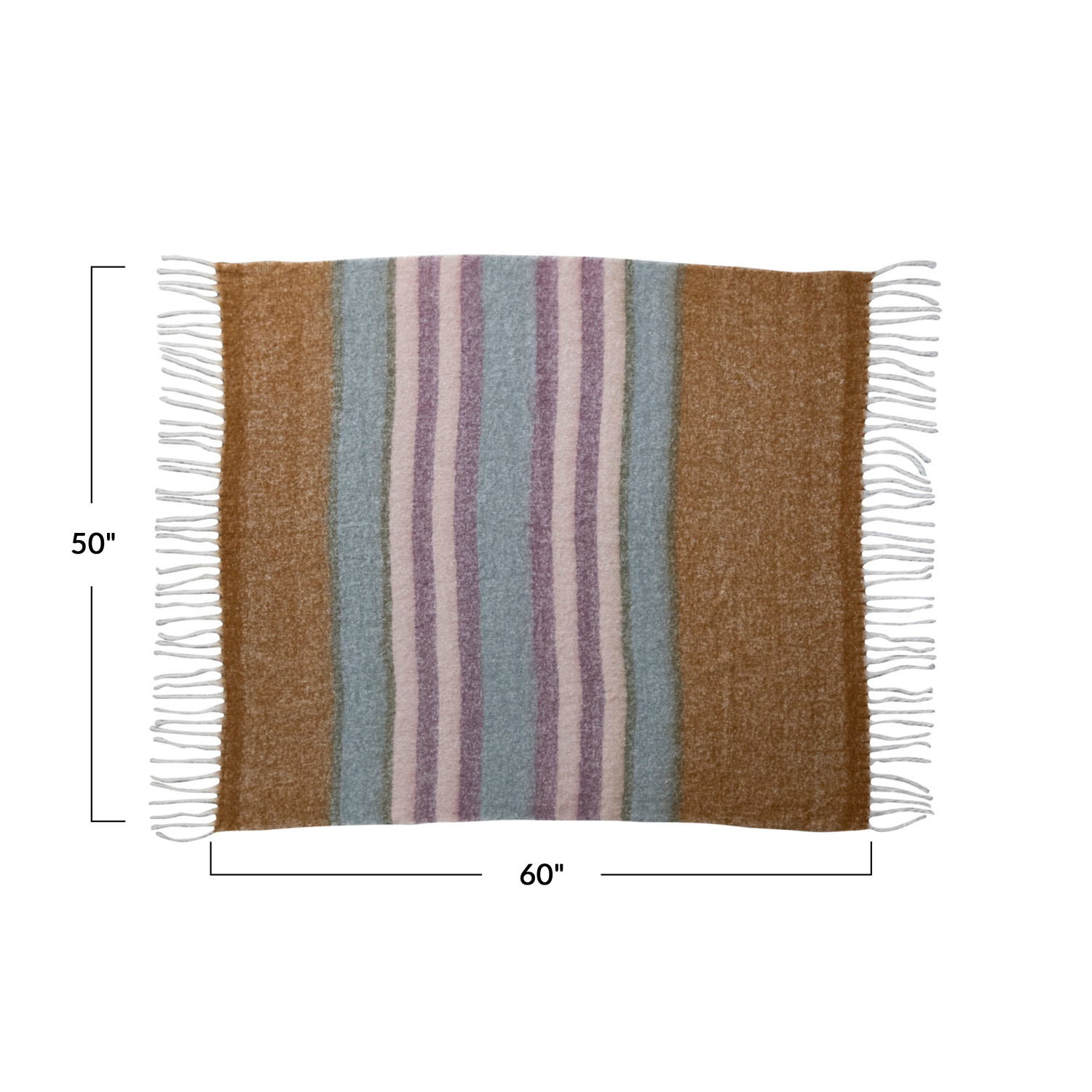 Catalog Name: 60"L x 50"W Brushed Acrylic & New Zealand Wool Throw w/ Stripes & Fringe, Multi Color