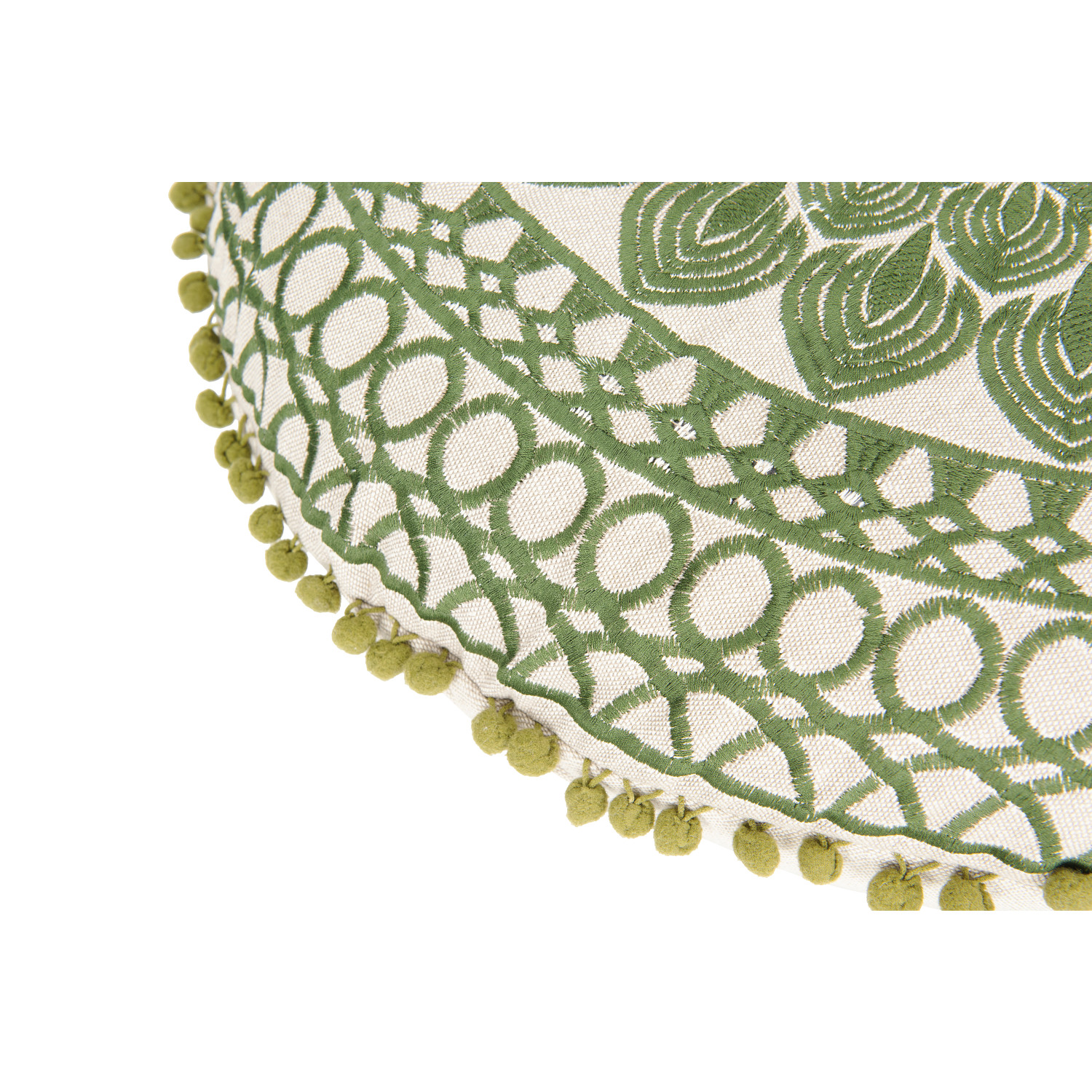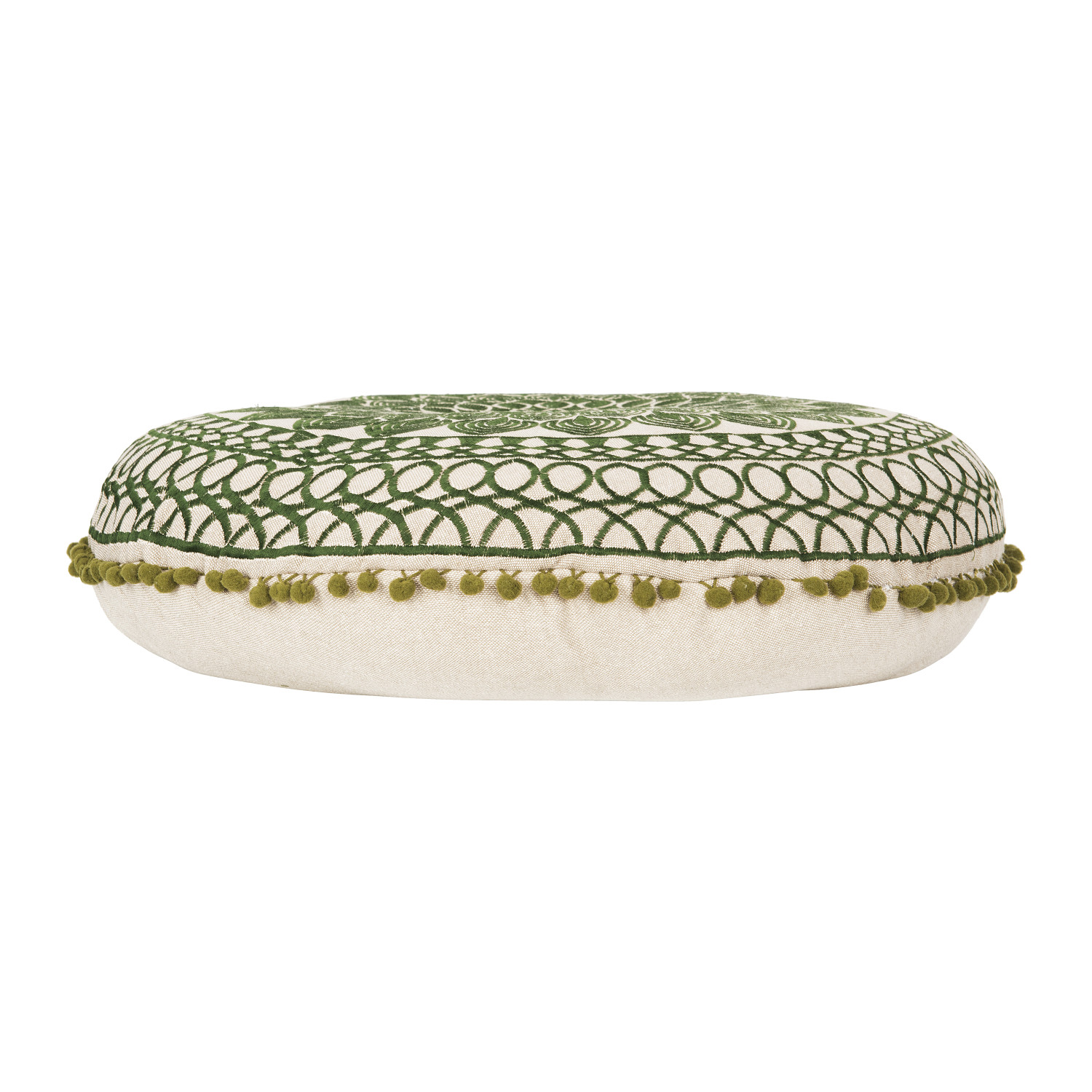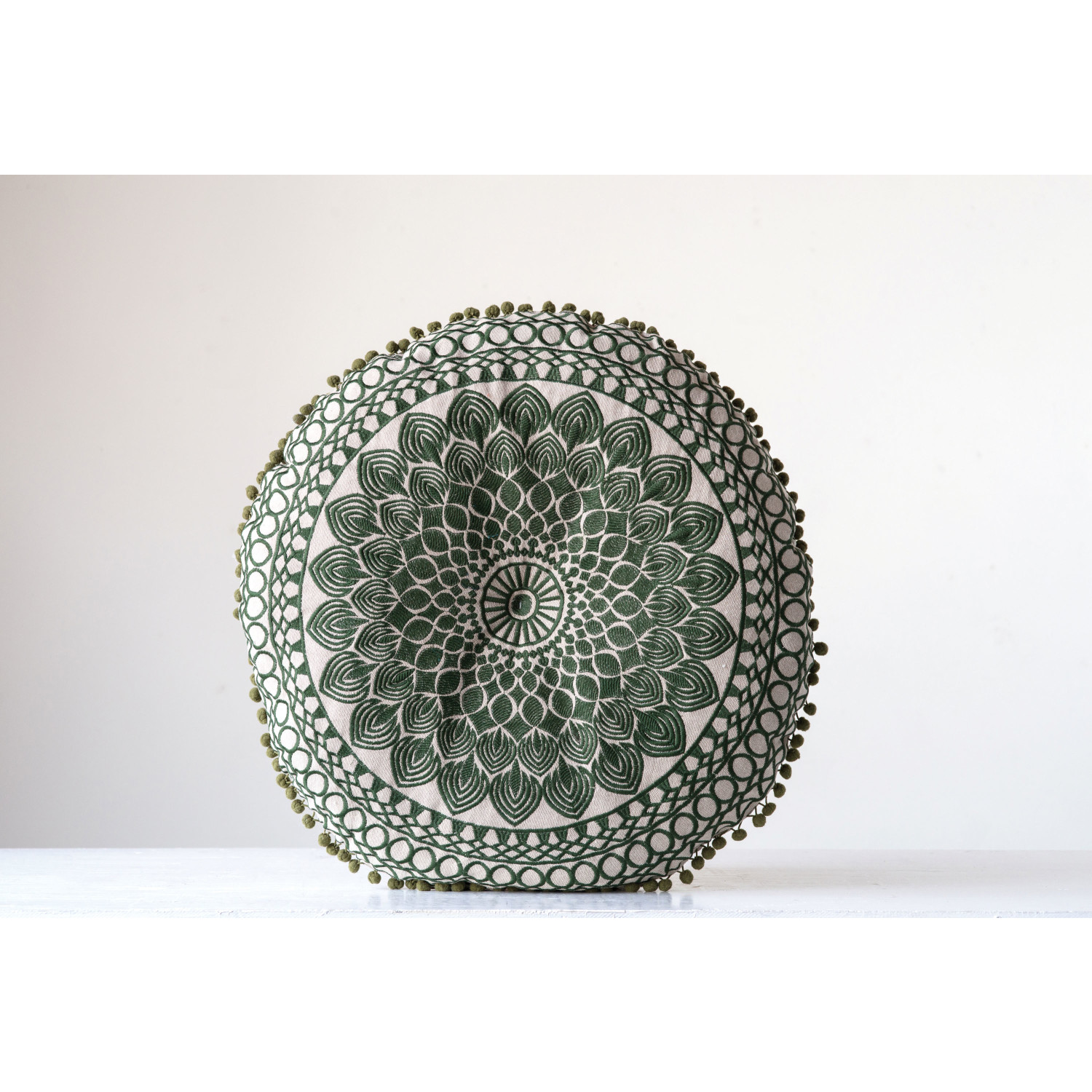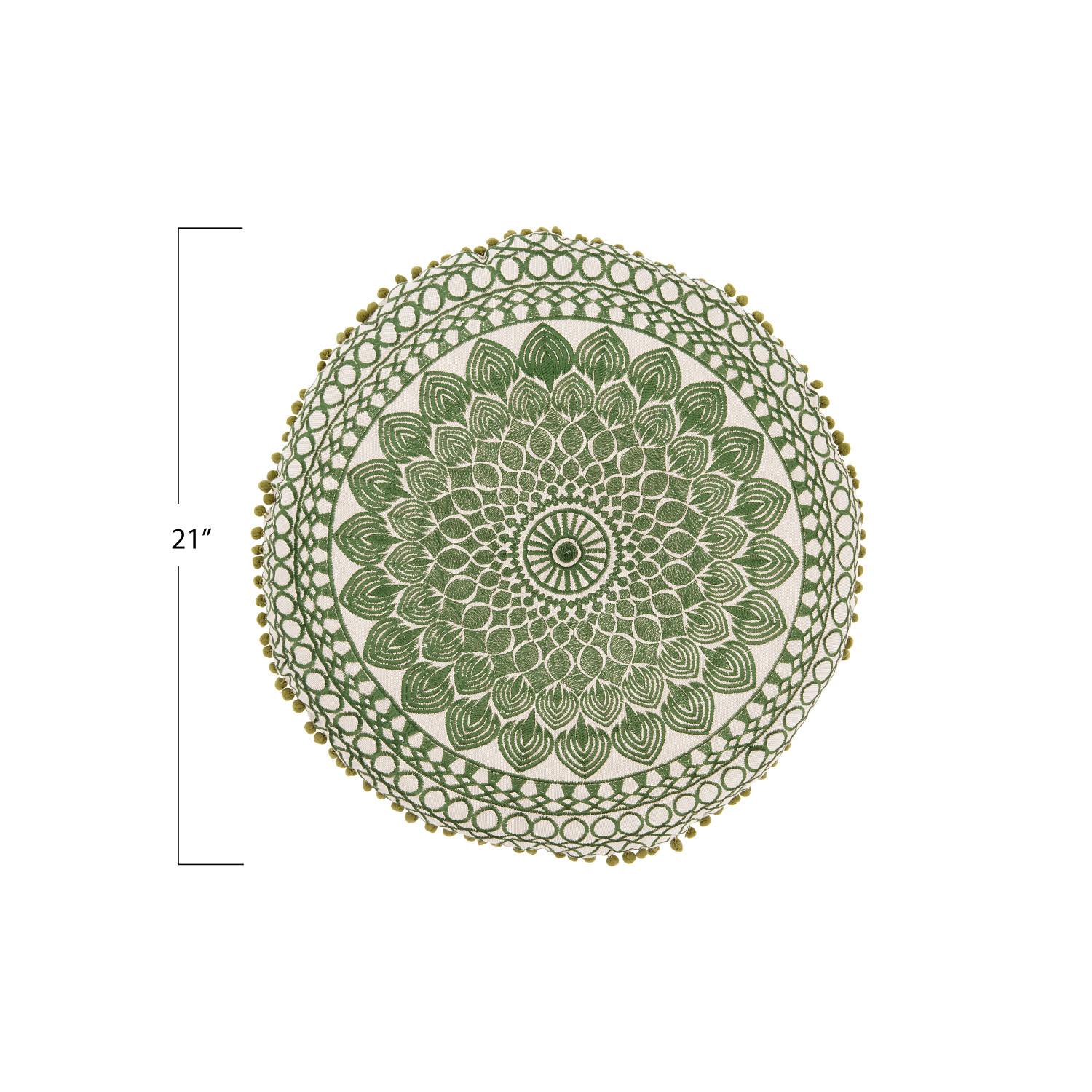 Catalog Name: 21" Round x 6"H Cotton Chambray Embroidered Pillow w/ Pom Pom Trim, Green