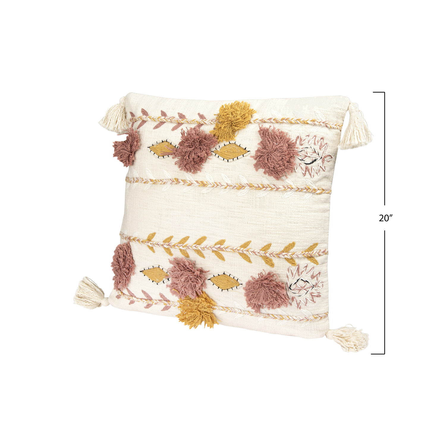 Catalog Name: 20" Square Cotton Pillow w/ Embroidery, Tassels & Applique, Cream Color
