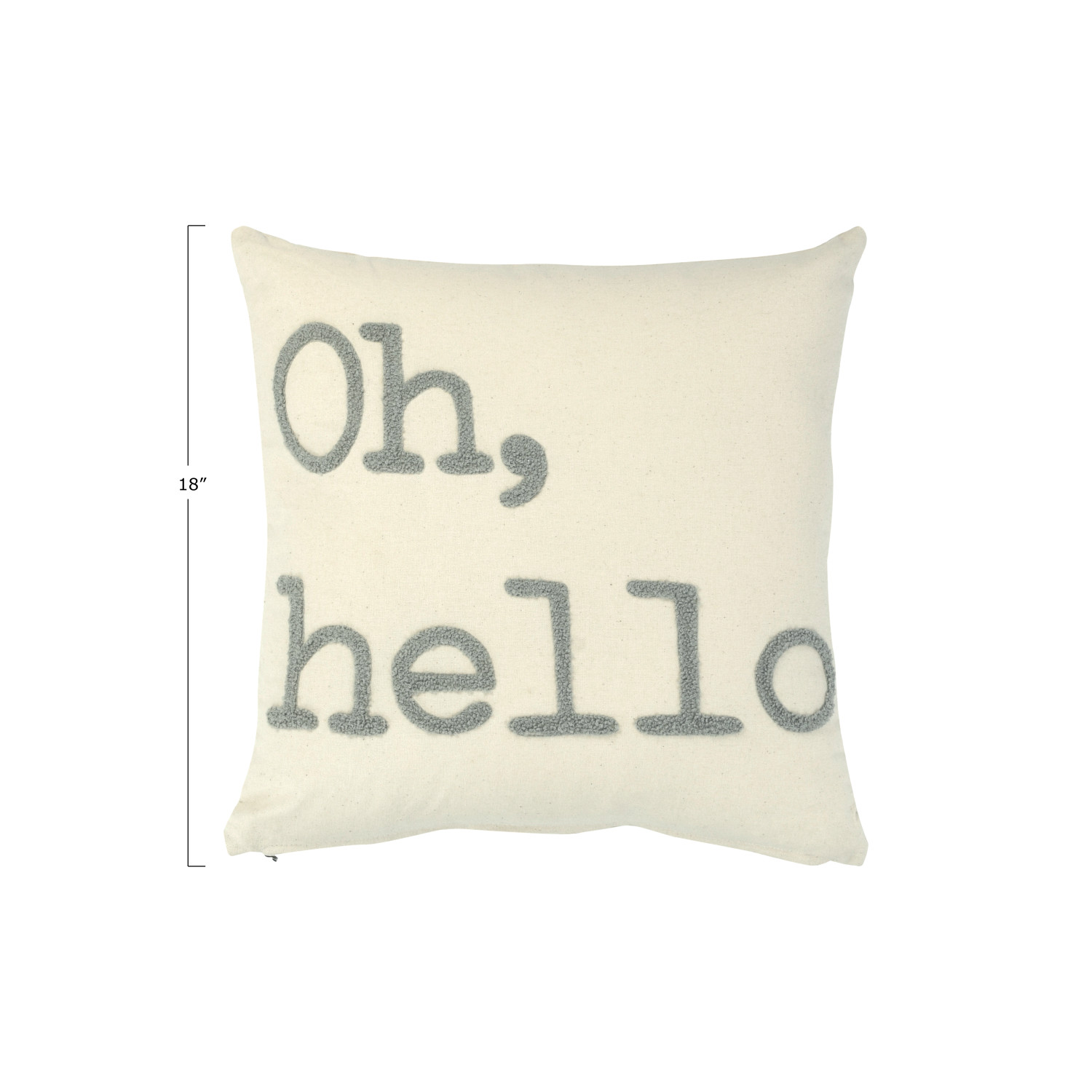 18" Cotton Pillow w/ Embroidery "Oh, Hello", Polyester Fill