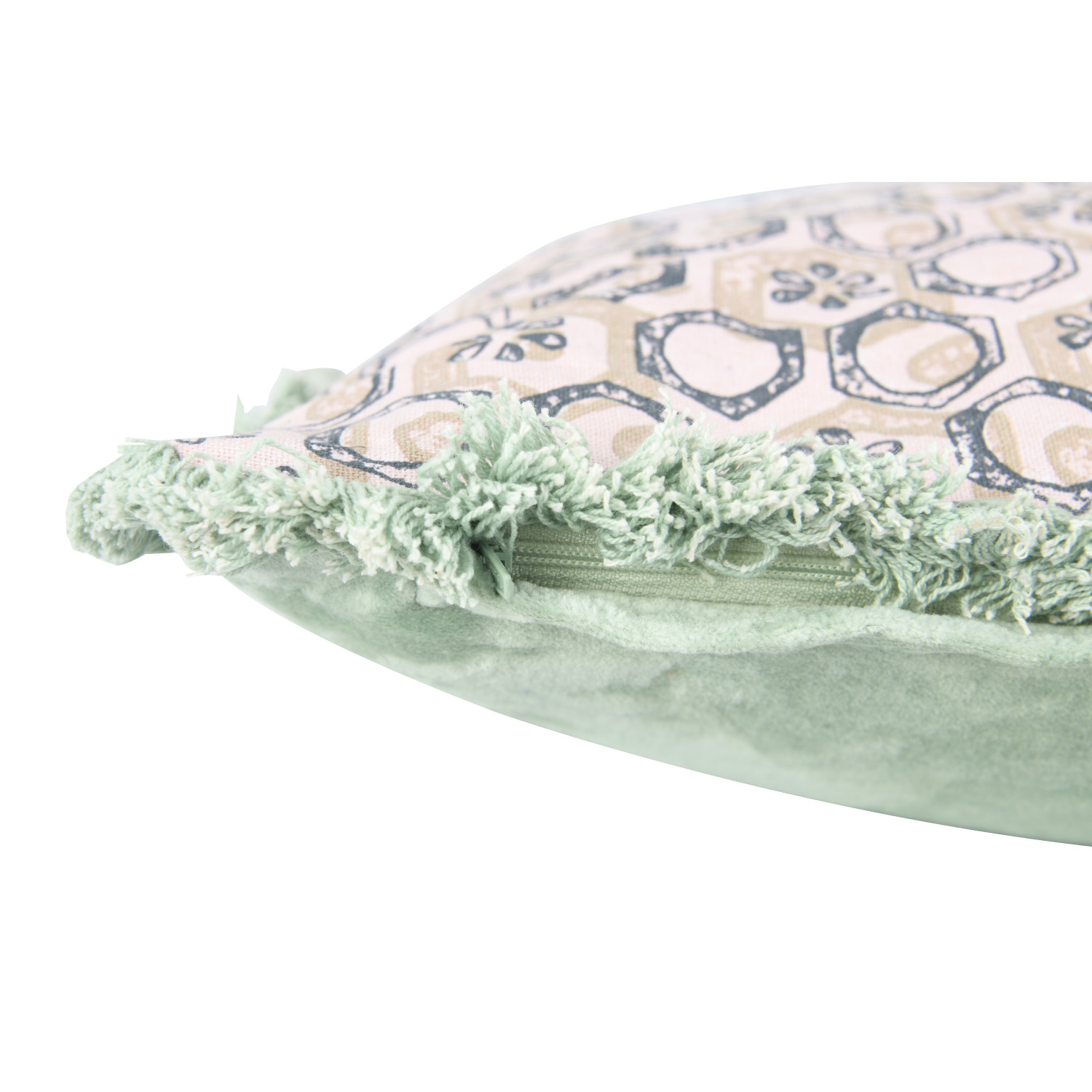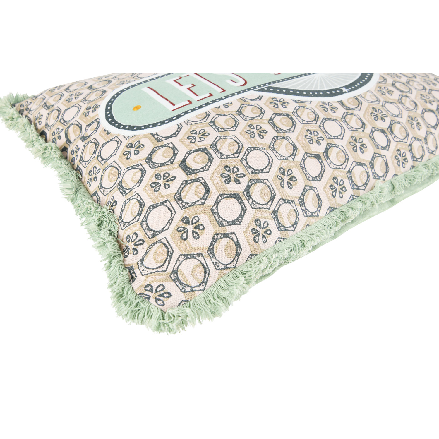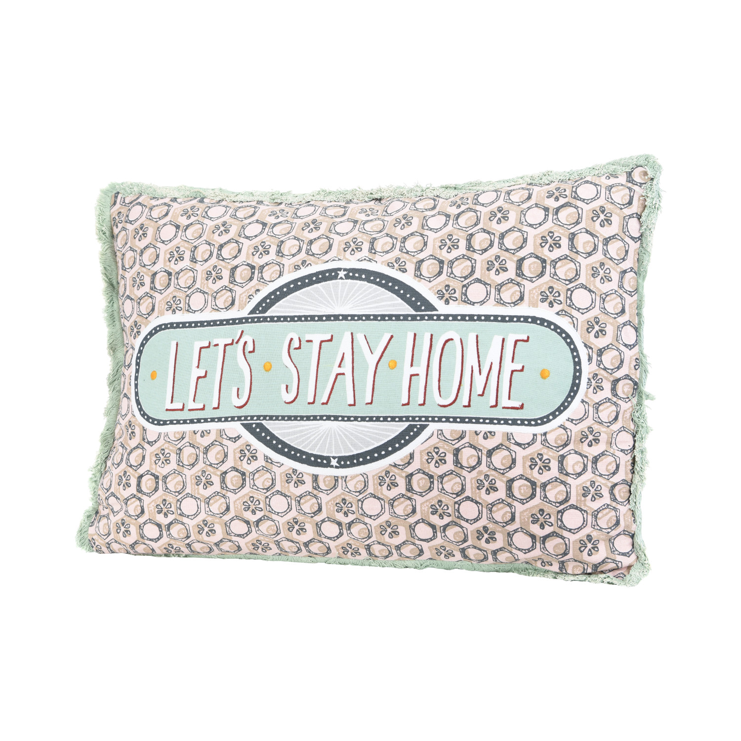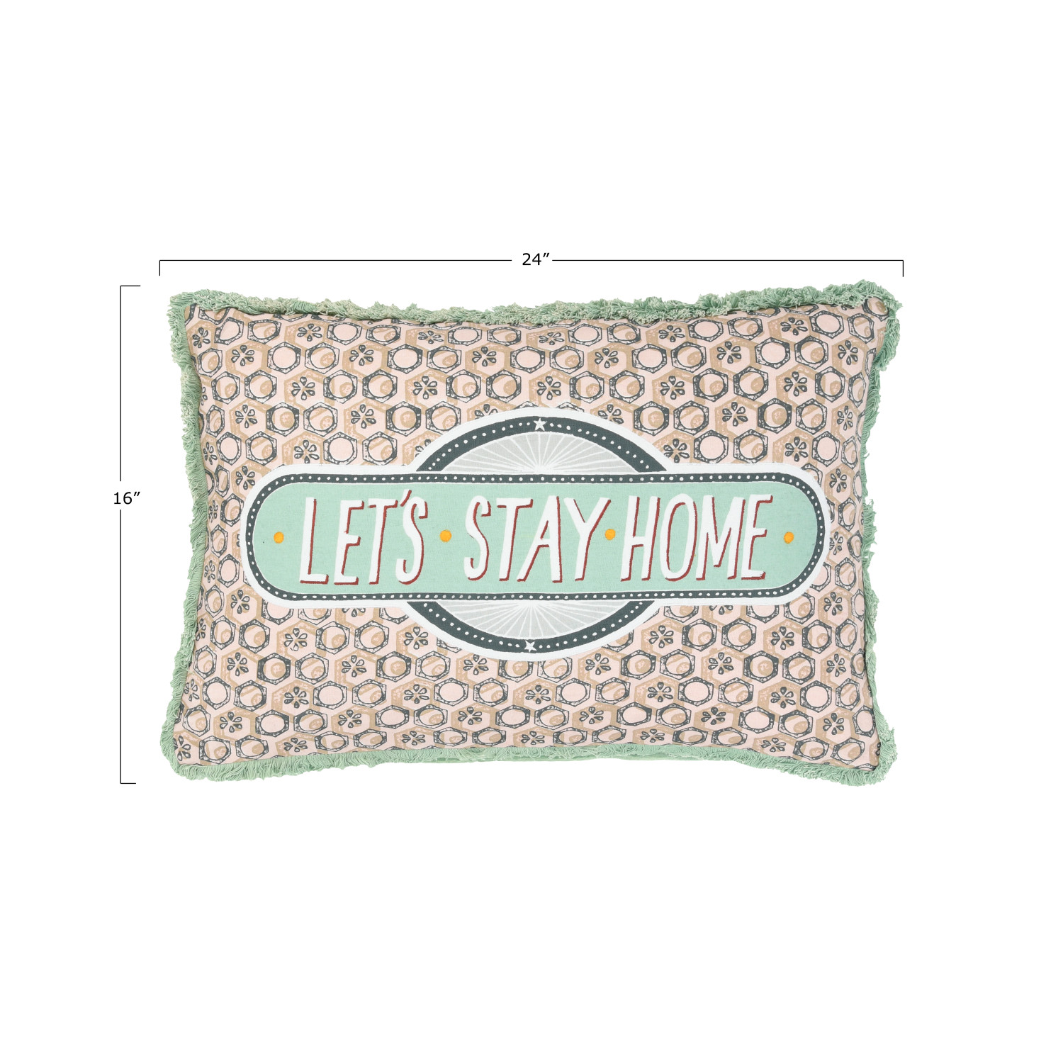 Catalog Name: 24"L x 16"H Cotton Lumbar Pillow w/ Cotton Velvet Back, Embroidery & Fringe "Let's Stay Home" ©