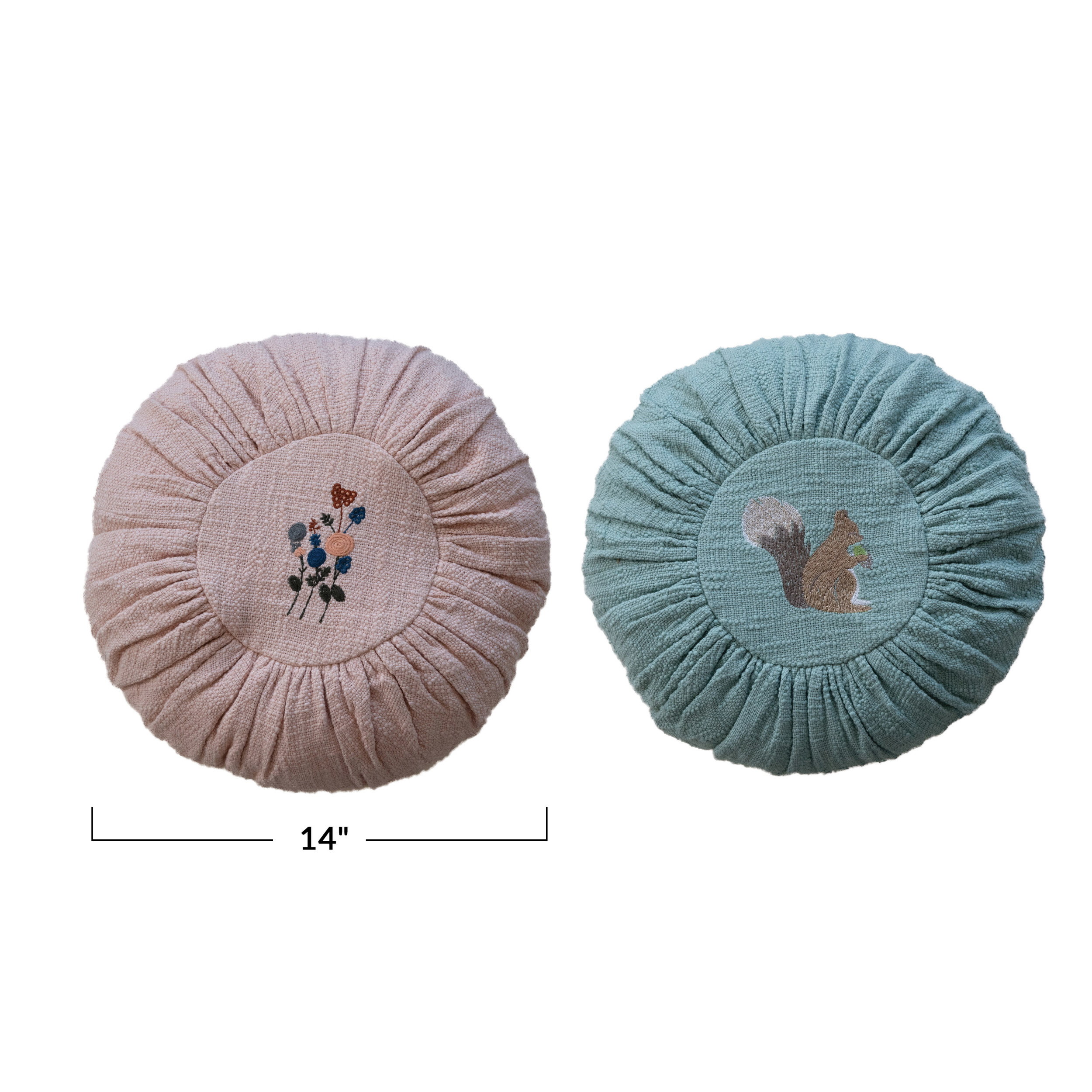 Catalog Name: 14" Round Cotton Slub Pillow w/ Embroidery, 2 Colors, 2 Styles