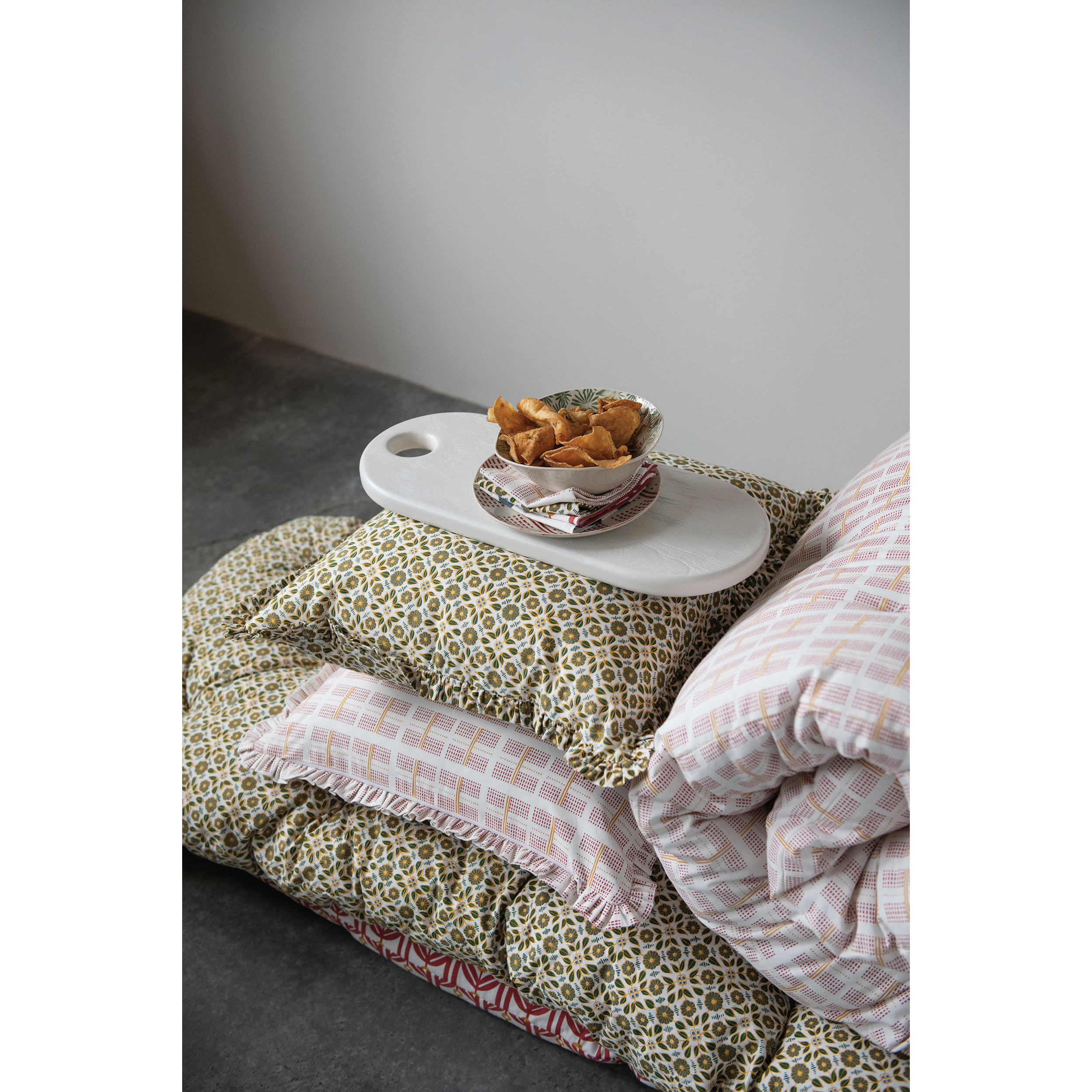 These cotton pillows instantly upgrade any couch or chair, and catches the eye effortlessly with their soft cotton construction and ruffled edges. Constructed of a removable cotton cover, for easy cleaning, with a filling made entirely of polyester. Measures 20" L x 20" W x 2" H.