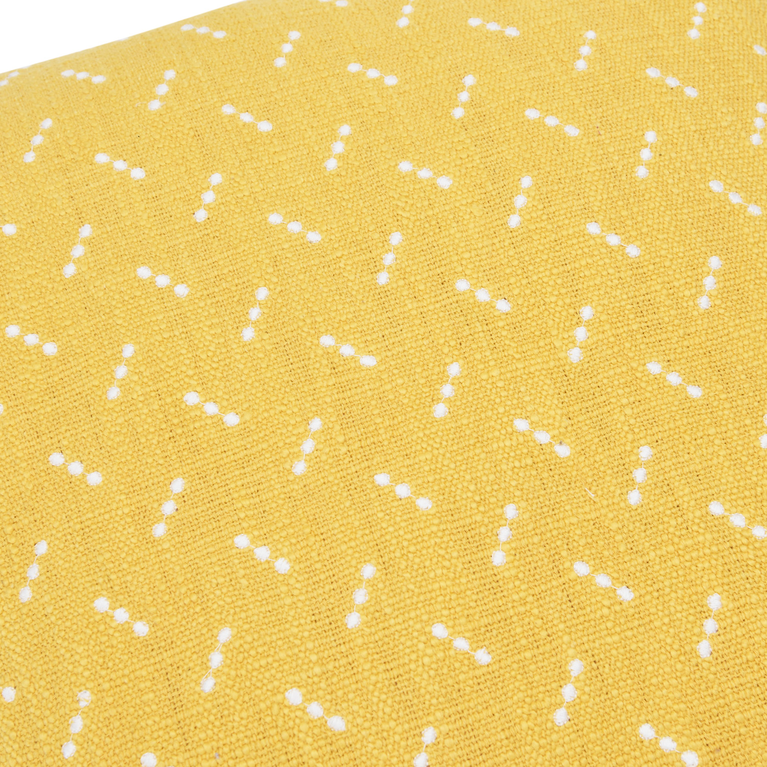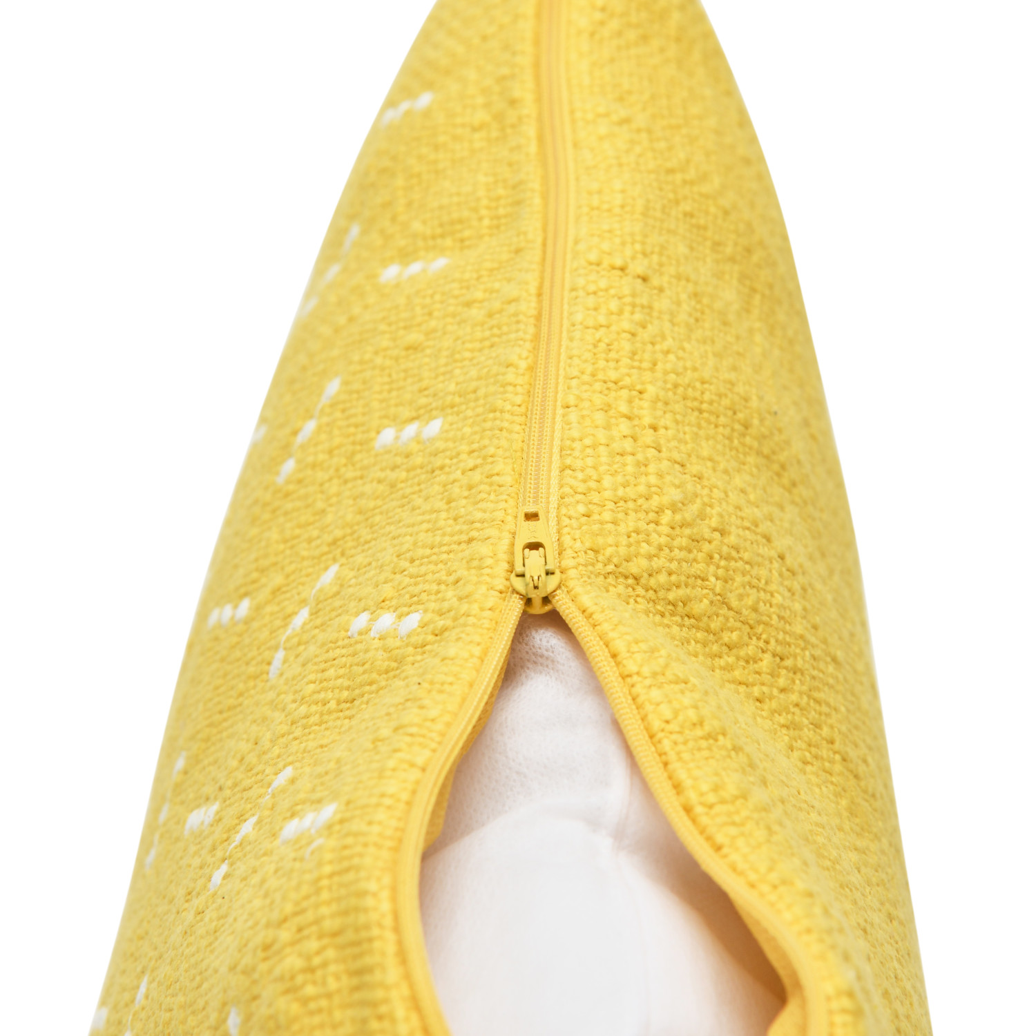 This subtly playful throw pillow cover showcases soft cotton slub, intricately embroidered with dots, and finished with decorative tassels. Square yellow and cream cotton throw pillow with embroidered dots and tassels; Cotton slub encasement on back. Express your constantly evolving style with the simple addition of this eye-catching pillow. Removable cotton throw pillow cover with polyester insert; Hidden in seam zipper closure; Machine wash cold with mesh bag, gentle cycle, do not bleach, warm iron if needed.
