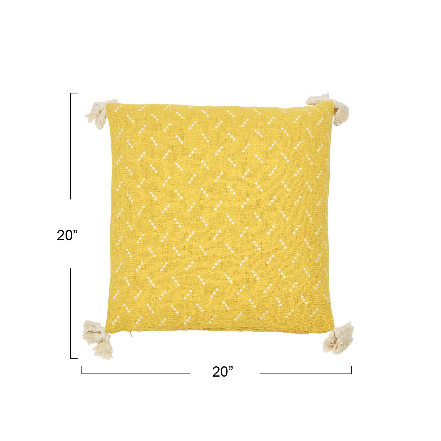 Catalog Name: 20" Square Cotton Slub Pillow w/ Embroidered Dots & Tassels, Polyester Fill, Yellow & Cream Color