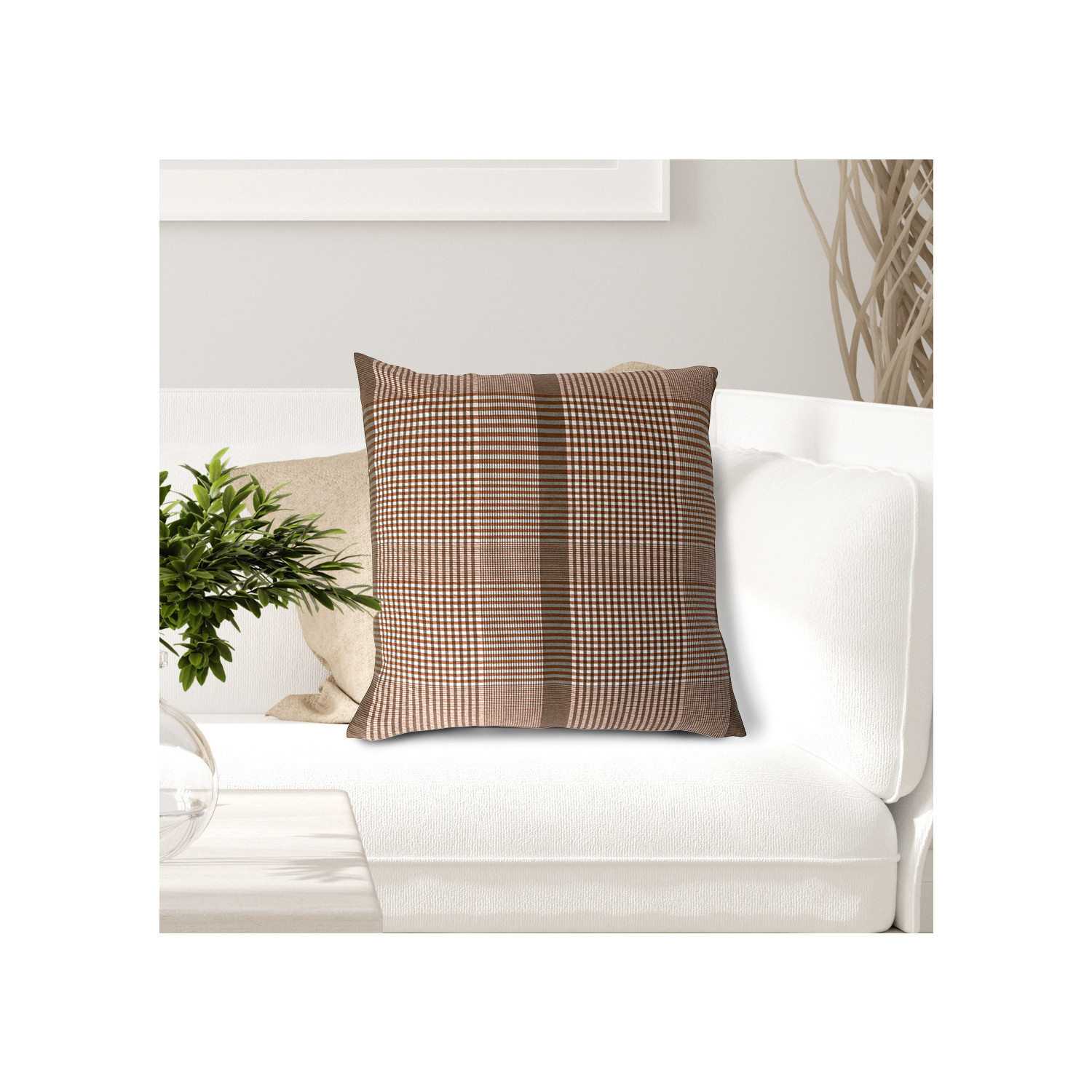 This sophisticated throw pillow features a classic plaid printed on durable woven cotton. Square woven cotton throw pillow with plaid pattern in brown and cream. Express your constantly evolving style with the simple addition of this eye-catching pillow. Removable cotton pillow cover and insert; Machine wash cold, gentle cycle; Do not bleach, warm iron if needed.