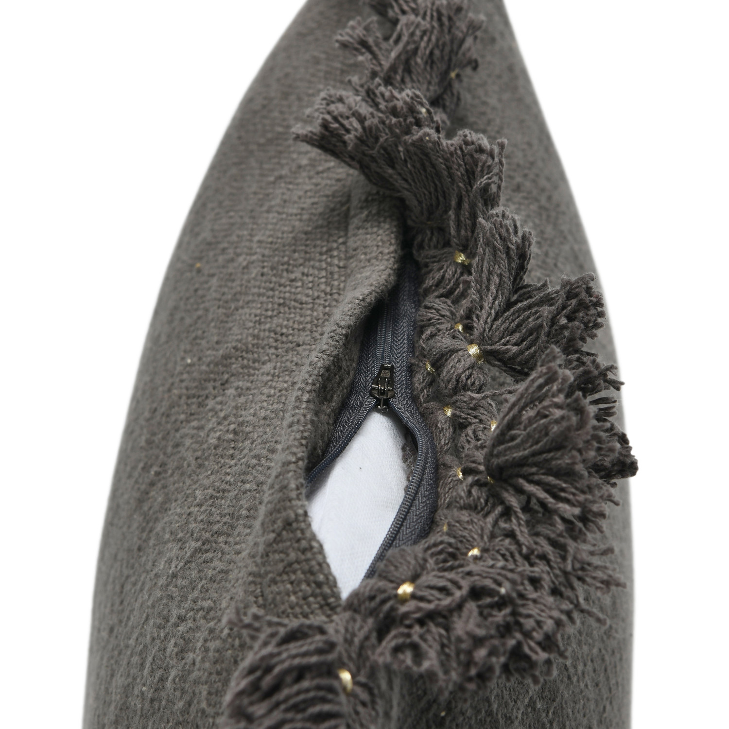 This boho-inspired throw pillow cover showcases soft cotton slub construction adorned with intricately crocheted, gilded fringe detail. Square charcoal grey cotton slub throw pillow with gold-wrapped crocheted fringe. Express your constantly evolving style with the simple addition of this eye-catching pillow. Removable throw pillow cover with polyester insert; Hand wash, do not bleach, do not tumble dry, do not dry clean, medium iron (do not iron on trim).