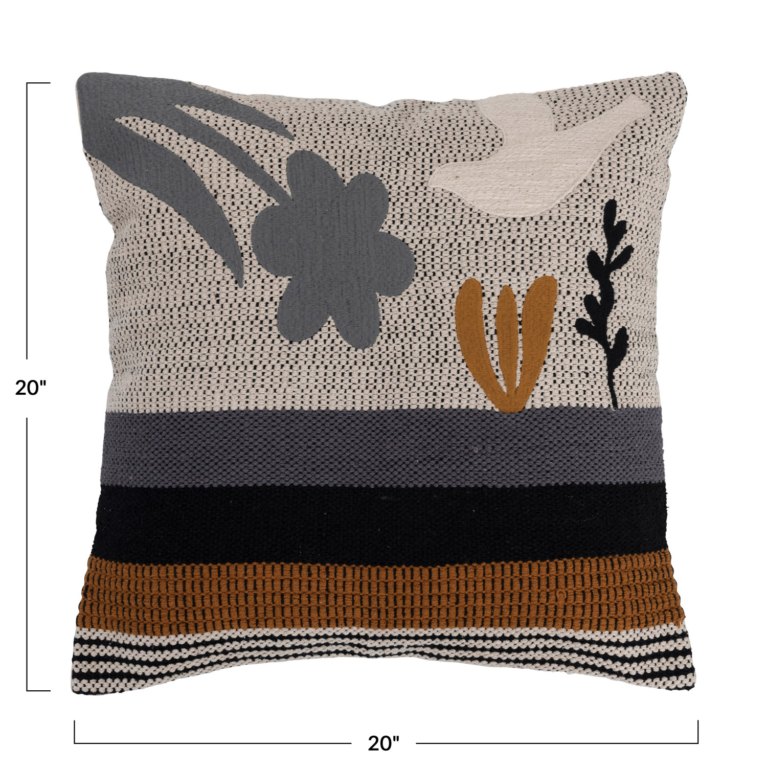 This modern, southwestern-inspired throw pillow cover showcases a woven cotton construction with a bold, embroidered bird and flora design. Square multicolor cotton throw pillow with bird and flower print; Cream cotton encasement on back. Express your constantly evolving style with the simple addition of this eye-catching pillow. Removable cotton throw pillow cover with polyester insert; Machine wash warm, gentle cycle, do not bleach, do not tumble dry, do not dry clean, medium iron.