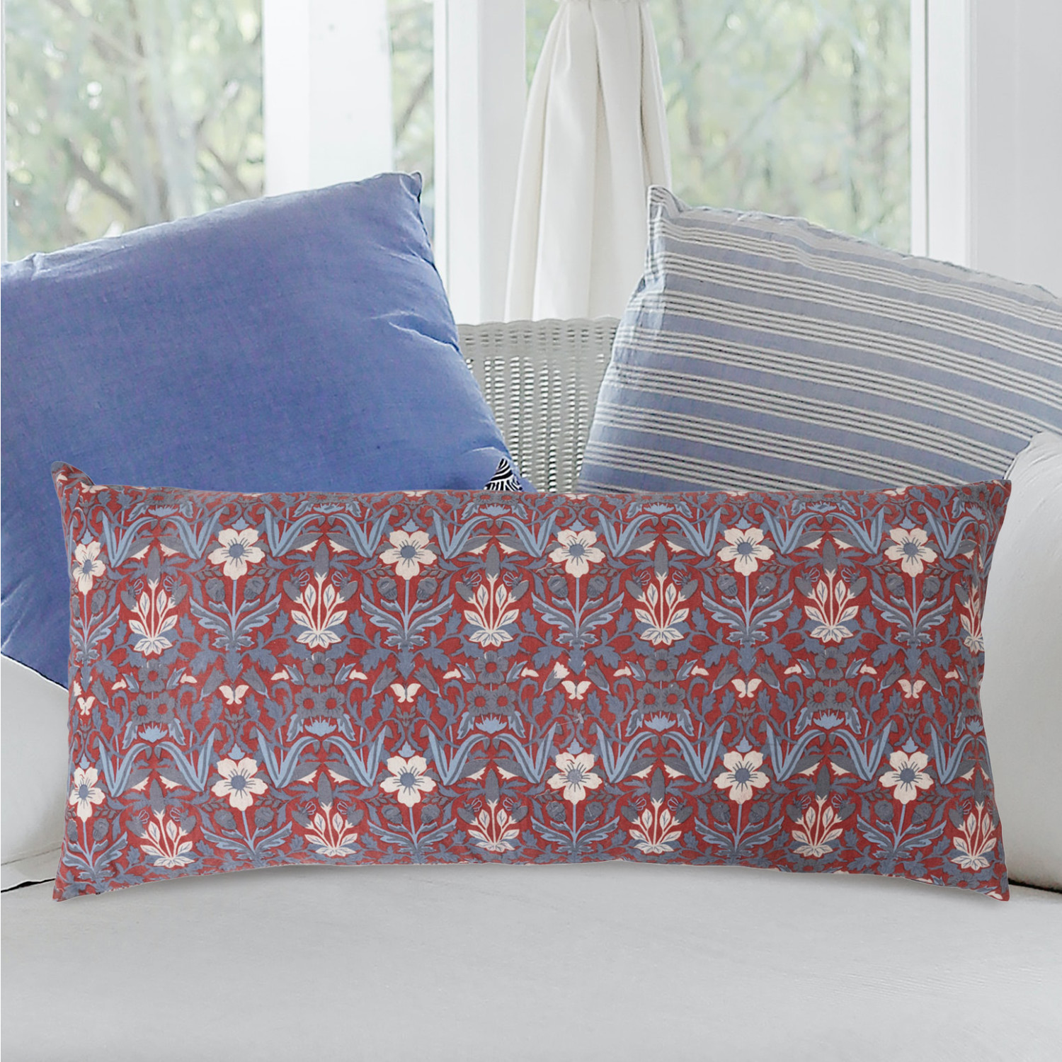 This elegant lumbar pillow showcases a stunning reproduction of a vintage floral print on soft woven cotton. Red, blue, and white cotton lumbar pillow with floral print. Express your constantly evolving style with the simple addition of this eye-catching pillow. Removable cotton lumbar pillow cover and insert; 30 degree wash, do not bleach, tumble dry low, do not dry clean, medium iron.