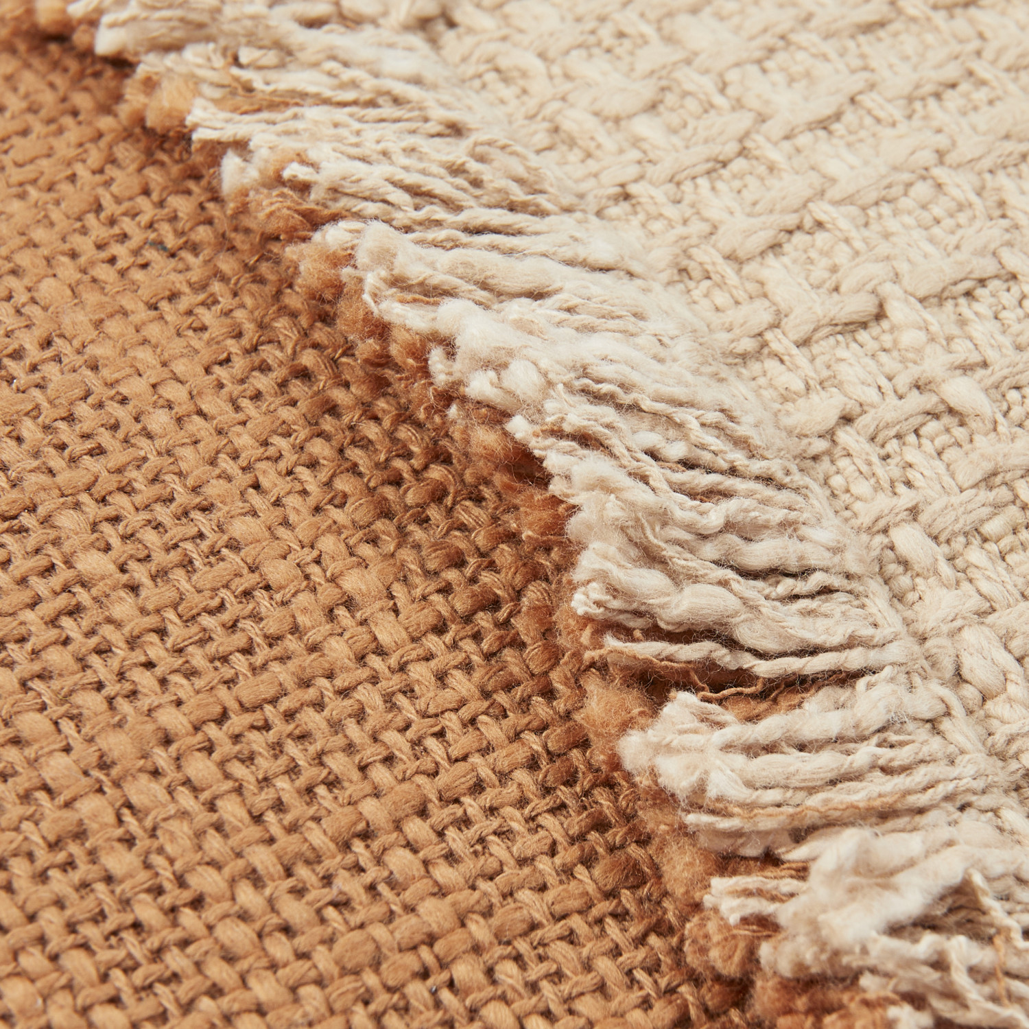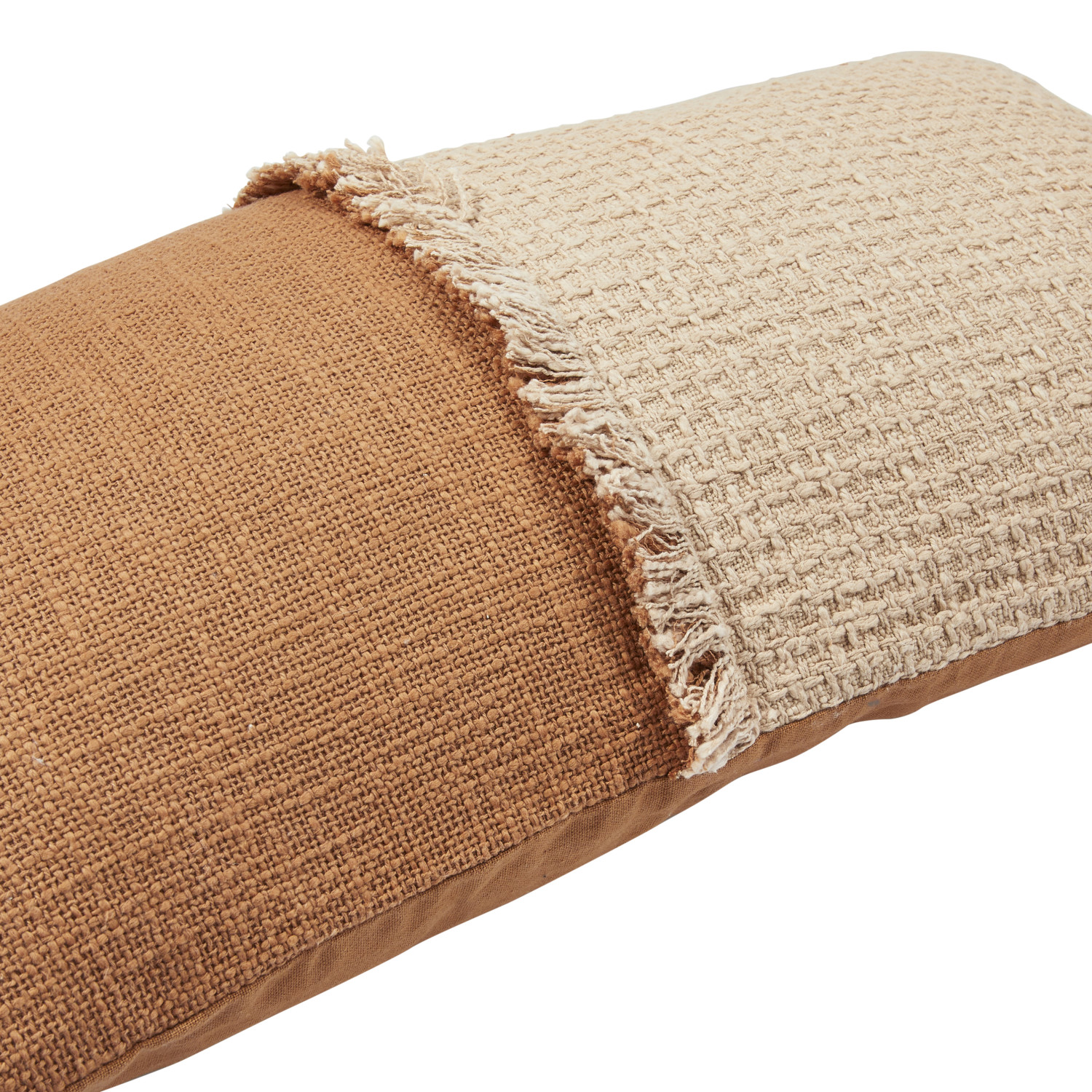 This rustically contemporary lumbar pillow features contrasting tones of durable woven cotton, finished with delicate fringe. Pink and rust woven cotton throw pillow with fringe; Rust cotton encasement on back. Express your constantly evolving style with the simple addition of this eye-catching pillow. Removable cotton pillow cover and insert; Back zipper with hidden flap; Machine wash cold, gentle cycle, tumble dry low, do not bleach, warm iron.