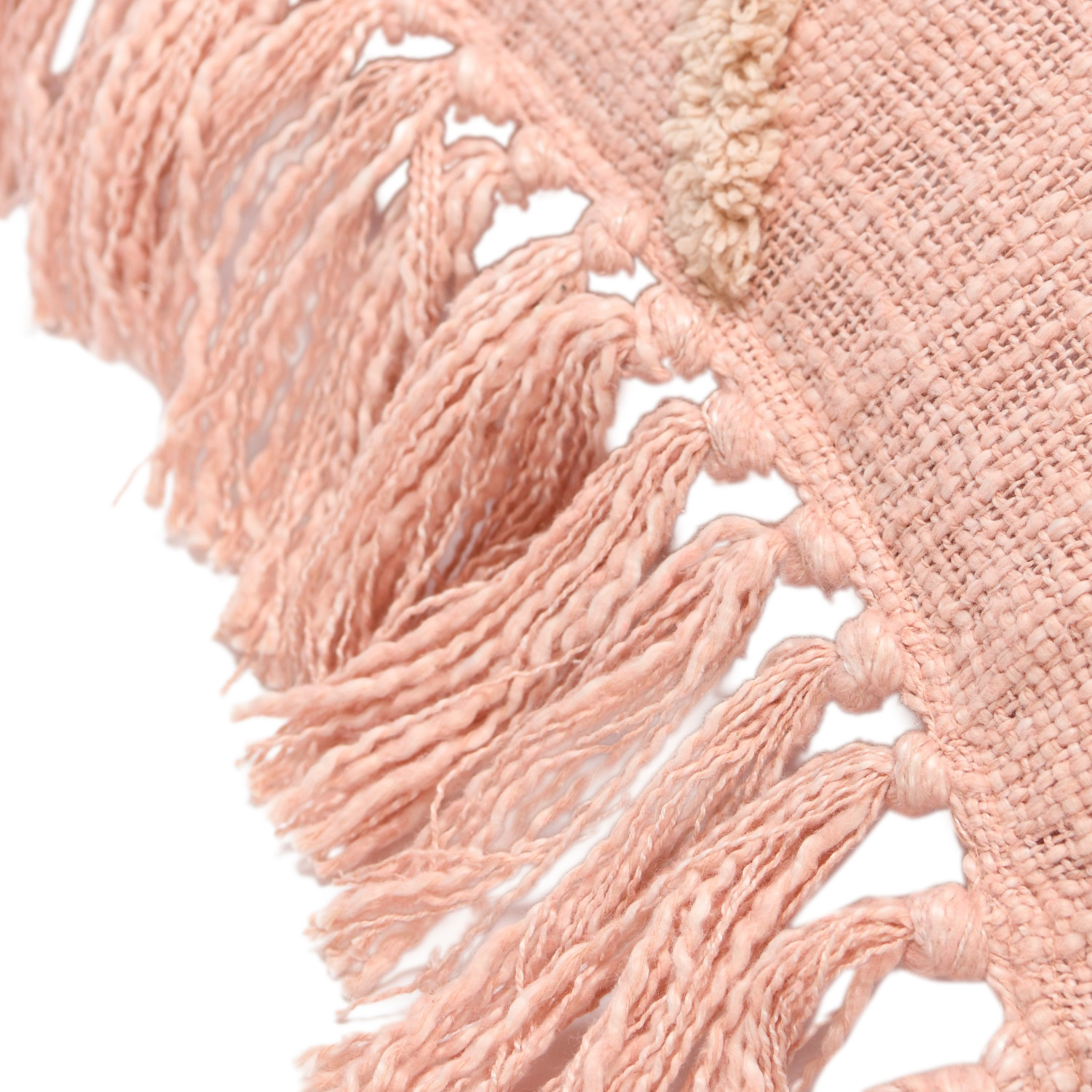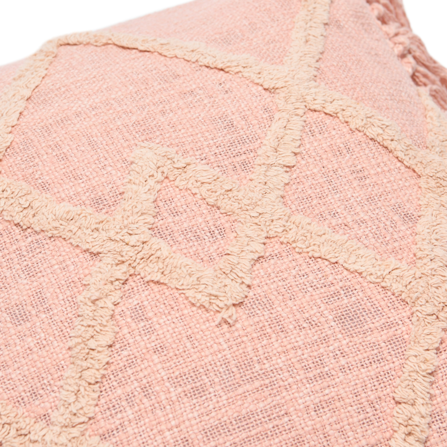 This modern boho throw pillow cover features a geometric tufted pattern on a cotton blend adorned with playful fringe. Square cotton blend throw pillow with tufted geometric design and fringe in pink; Pink cotton encasement on back. Express your constantly evolving style with the simple addition of this eye-catching pillow. Removable cotton pillow cover with polyester insert; Back zipper with hidden flap; Hand wash, warm iron if needed.