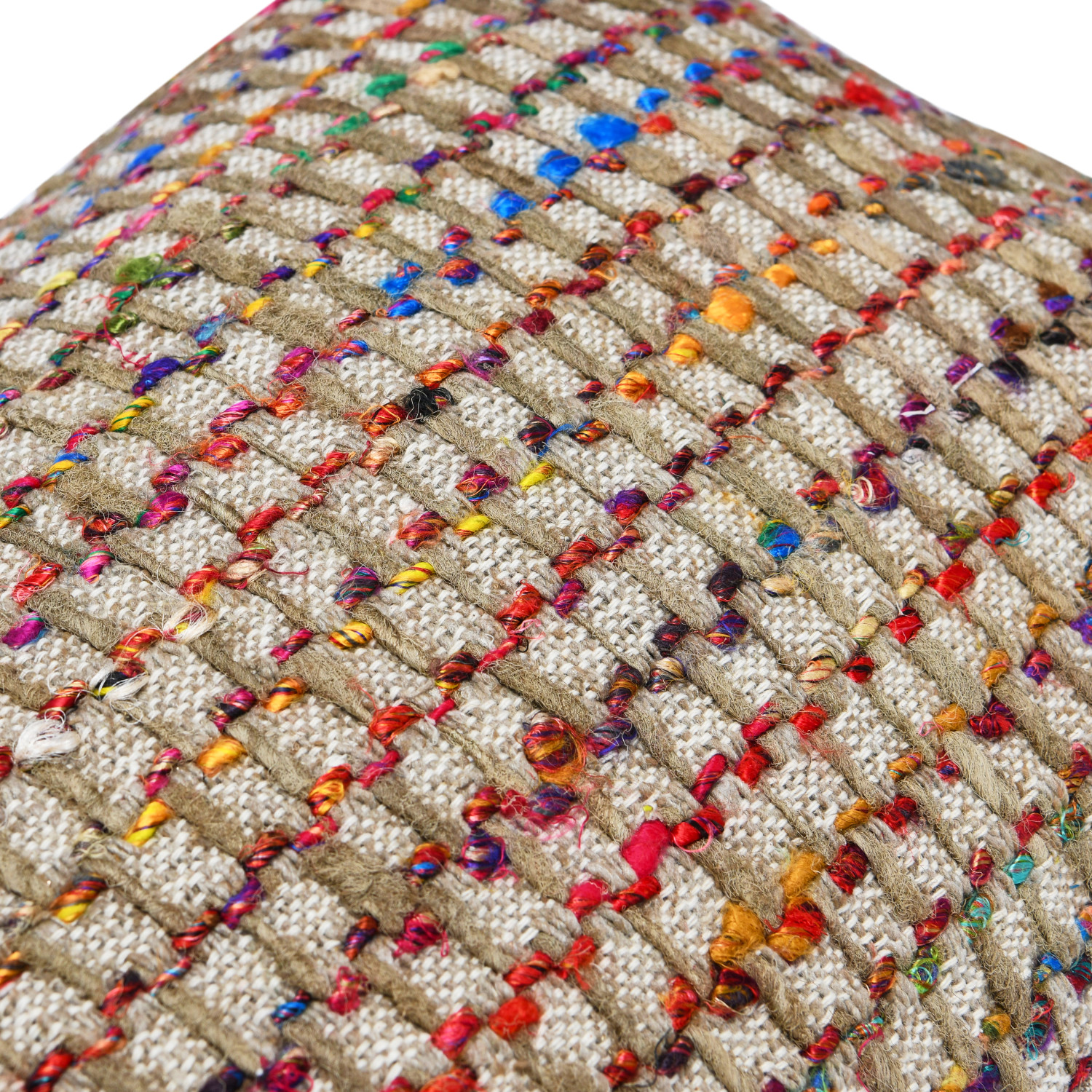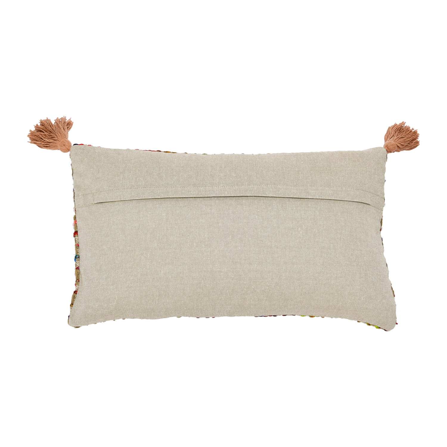 This unique lumbar pillow features an intricately woven multicolor cotton blend, finished with decorative tassels. Multicolor cotton blend lumbar pillow with tassels and chambray back. Express your constantly evolving style with the simple addition of this eye-catching pillow. Removable cotton lumbar pillow cover and insert; Back zipper with hidden flap; spot clean only.