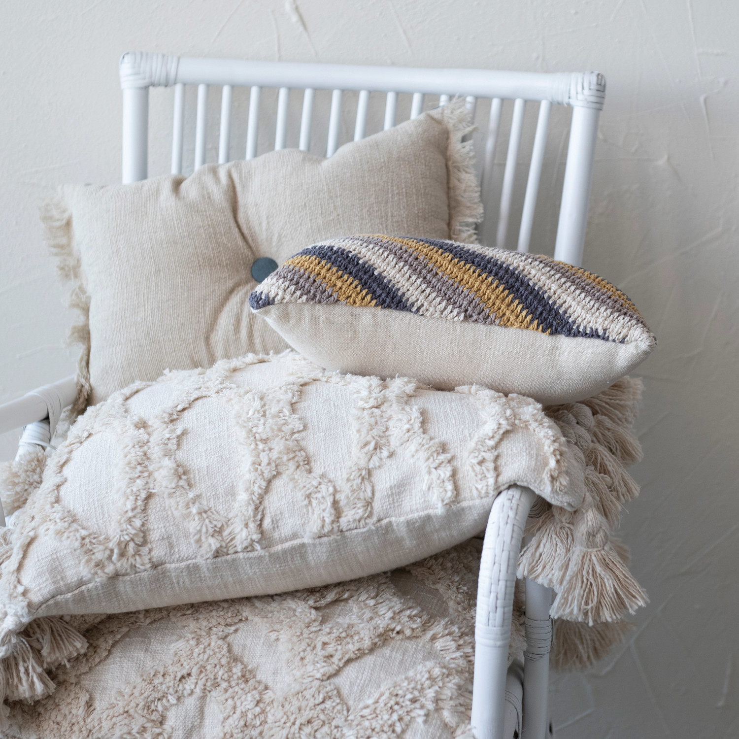 Natural and blue 2-sided linen blend tufted lumbar pillow with button and fringe. Machine Wash Warm, Gentle Cycle, Do Not Bleach, Tumble Dry Low, Warm Iron if Needed. Prop 65 Compliant.