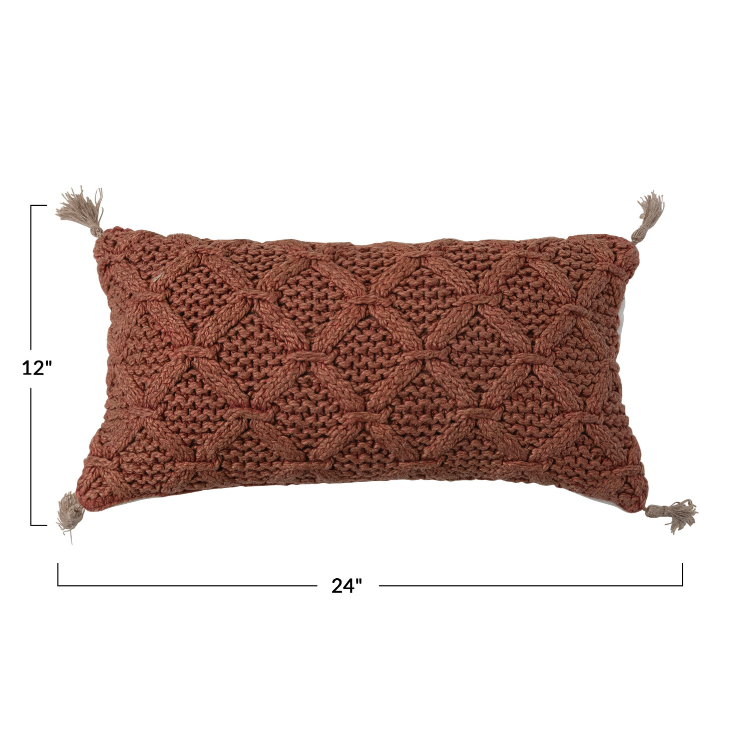 Catalog Name: 24"L x 12"H Woven Cotton Slub Lumbar Pillow w/ Diamond Pattern & Jute Tassels, Rust Color