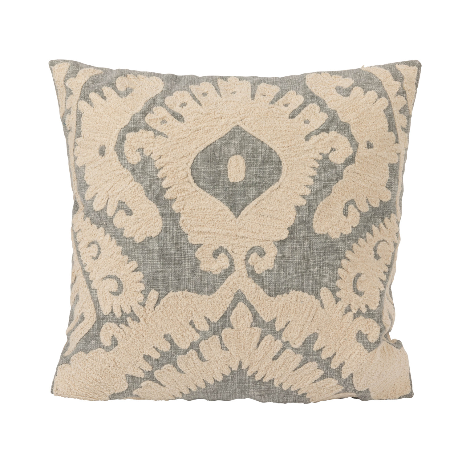 This elegant blue and cream cotton slub tufted pillow with a damask pattern and chambray back is the perfect way to add a touch of sophistication and style to any home. The soft yet durable cotton slub fabric and intricate damask pattern make it a statement piece in any room. At the same time, the chambray back provides a stylish contrast and visual interest from all angles. Filled with polyester, this pillow provides excellent support and plushness, making it perfect for adding extra lumbar support or layering with other pillows on the sofa or bed. The pillow features a zipper closure for easy insert removal and is machine-washable for easy care. It is also perfect for any room in the home, from the living room to the bedroom. The cushion measures 20 inches long and 20 inches high. Whether used as a lumbar support on the couch or as a decorative accent on the bed, this pillow will surely be a welcome addition to the home and will make the home more beautiful and cozy. Add a touch of elegance and texture to any space with this square cotton slub tufted pillow with an intricate damask pattern in shades of blue and cream. Zipper closure; it complement any traditional to contemporary home or office décor. Polyester fill insert included. The pillow cover is made from cotton; the insert is made from polyester.