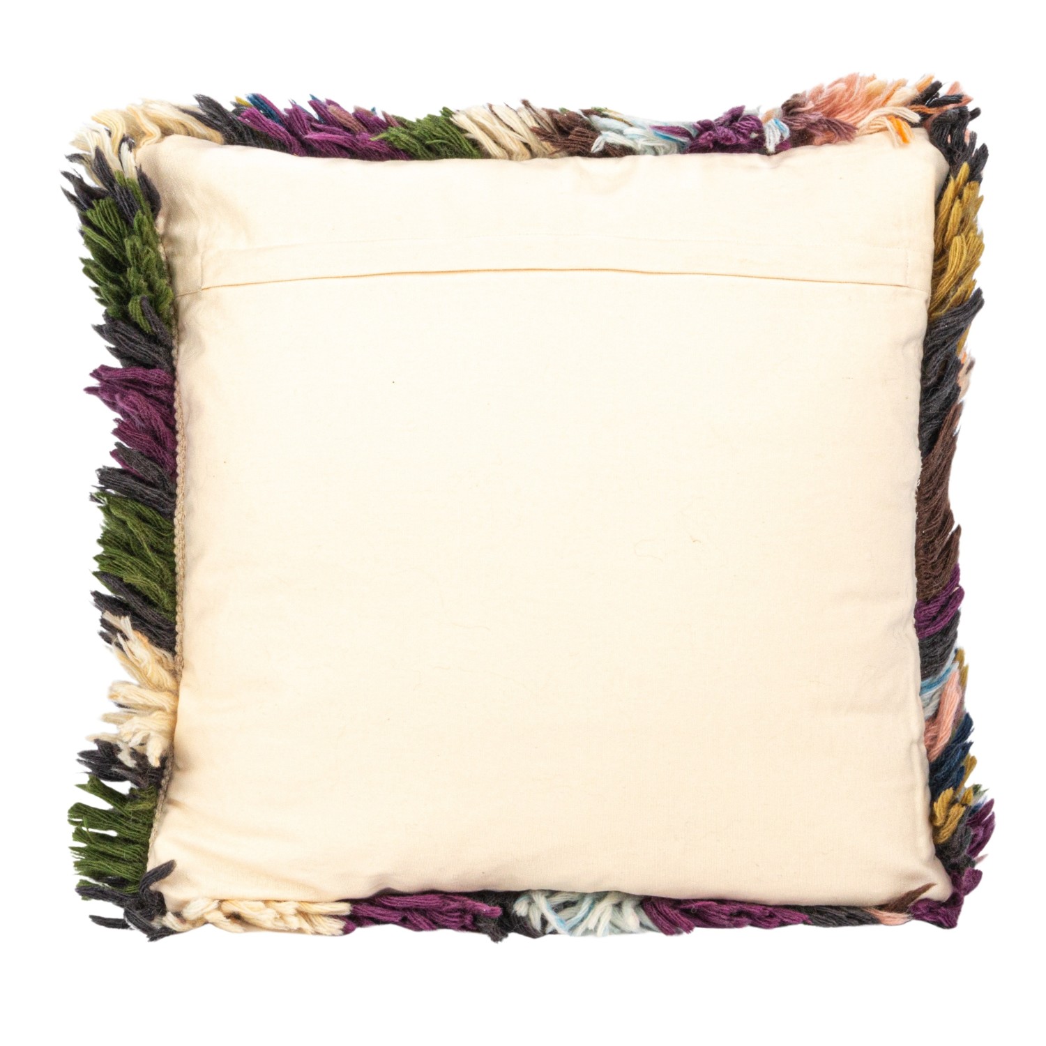 This woven New Zealand wool shag pillow with a cotton back, multi color, is a plush and cozy piece that adds a touch of farmhouse, boho, modern, eclectic, or casual style to any space. The multi-colored fabric, made of New Zealand wool, creates a rich, fluffy look and a soft, warm feel. The pillow's natural color palette, including blue, green, yellow, and orange, creates contrast and interest in the space. The cotton back is smooth and durable, complementing the front and creating a harmonious look. The polyester fill provides extra support and durability. The pillow measures 20 inches in length and 20 inches in width, making it a perfect size for any sofa, chair, or bed. It is easy to care for and spot clean only. This versatile accessory is perfect for creating a cozy and inviting atmosphere or a lively and stylish vibe in any space.