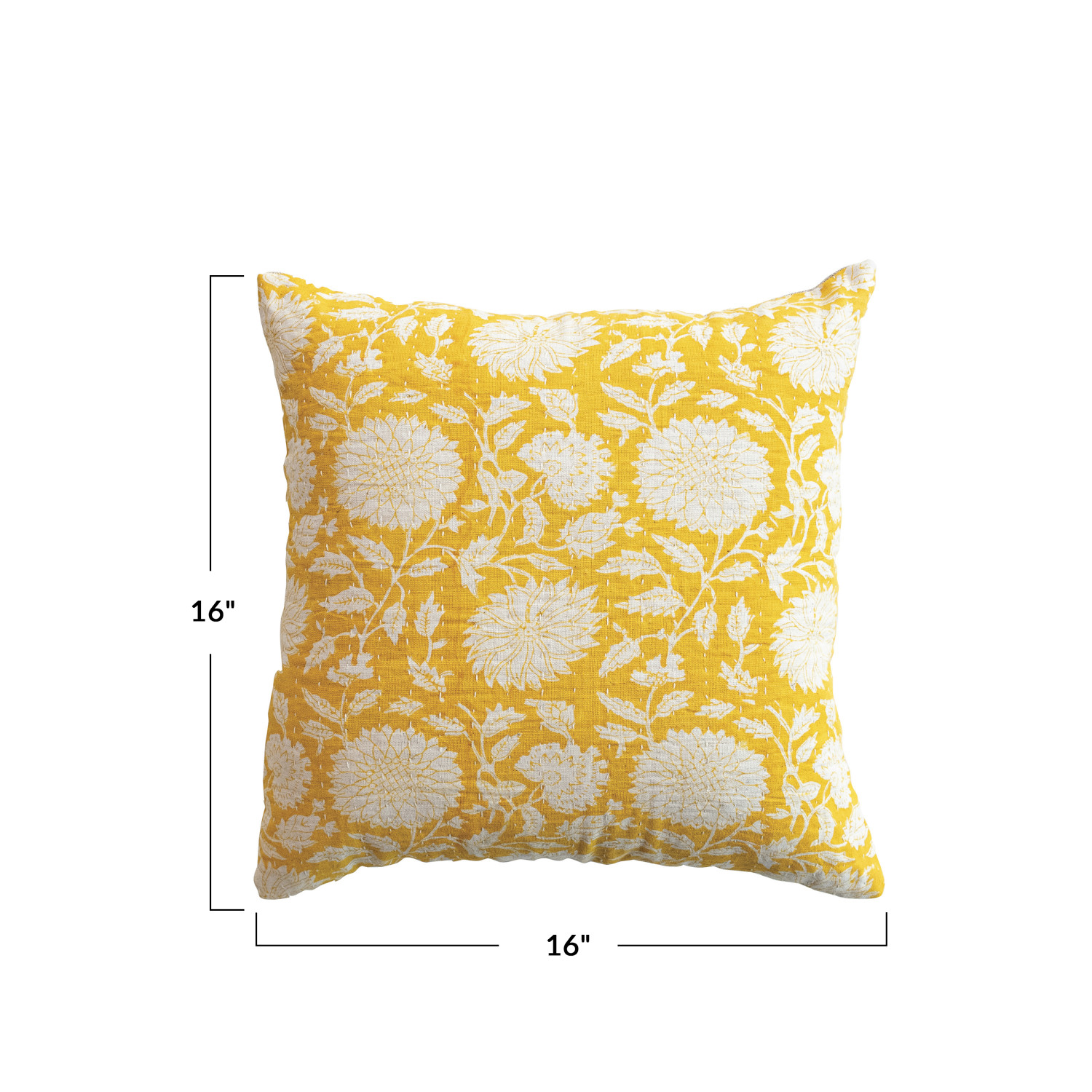 Catalog Name: 16" Square Cotton & Linen Voile Block Printed Pillow w/ Floral Pattern, Hand-Embroidered Kantha Stitch & Chambray Back, Yellow & Natural