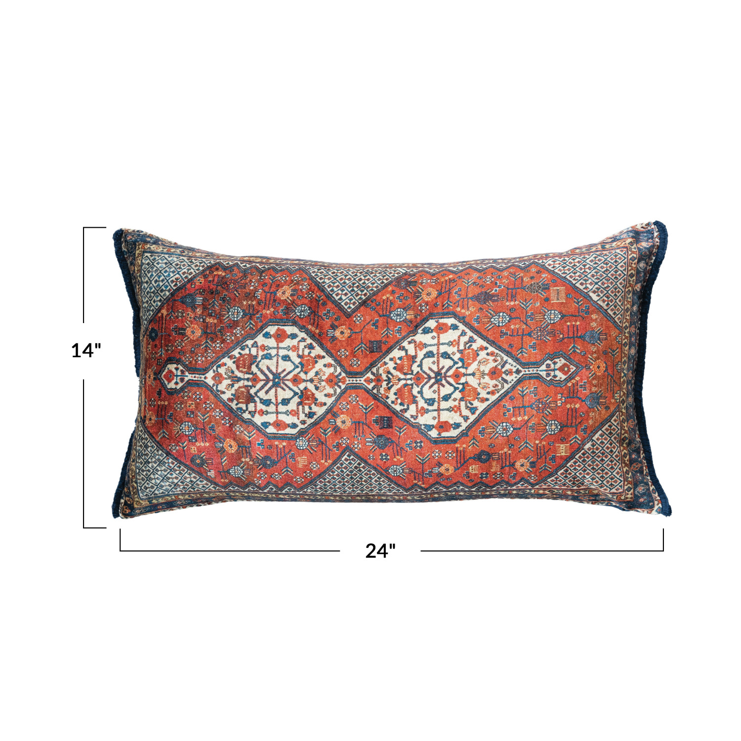 Catalog Name: 24"L x 14"H Cotton Blend Velvet Printed Lumbar Pillow w/ Vintage Carpet Pattern & Fringe, Multi Color