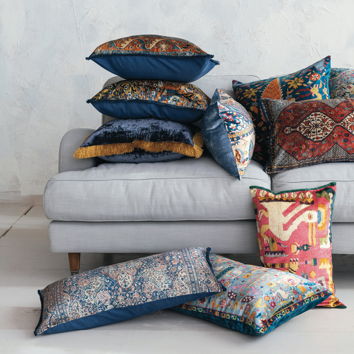 Catalog Name: 20"L x 14"H Cotton Blend Velvet Printed Lumbar Pillow w/ Vintage Carpet Pattern & Fringe, Multi Color