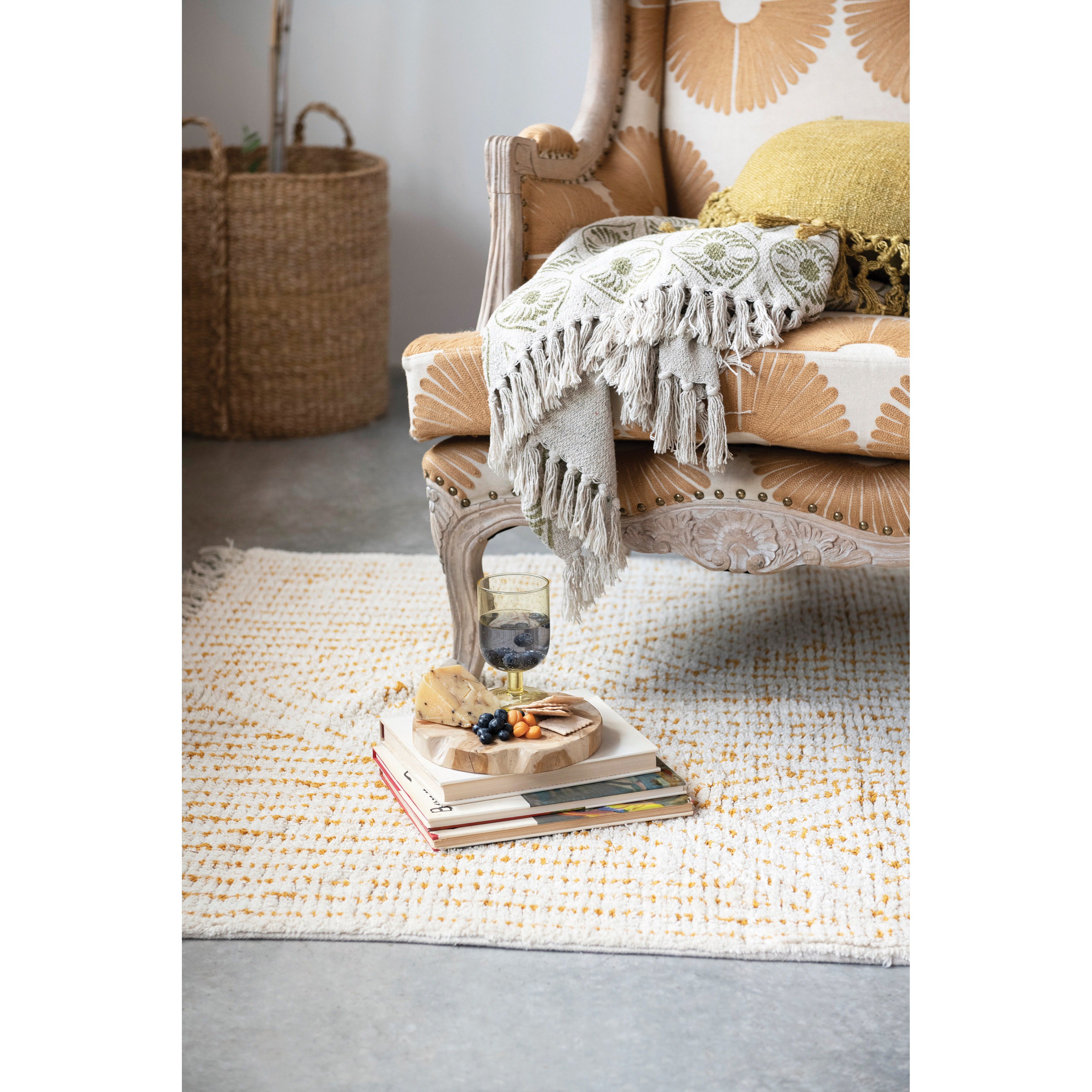 This boho inspired rug showcases a geometric striped pattern on stonewashed tufted cotton with fringe. Ivory and mustard stonewashed cotton tufted rug with geometric striped pattern and fringe. Spot Clean Only. 97% Cotton, 3% Other Fibers.