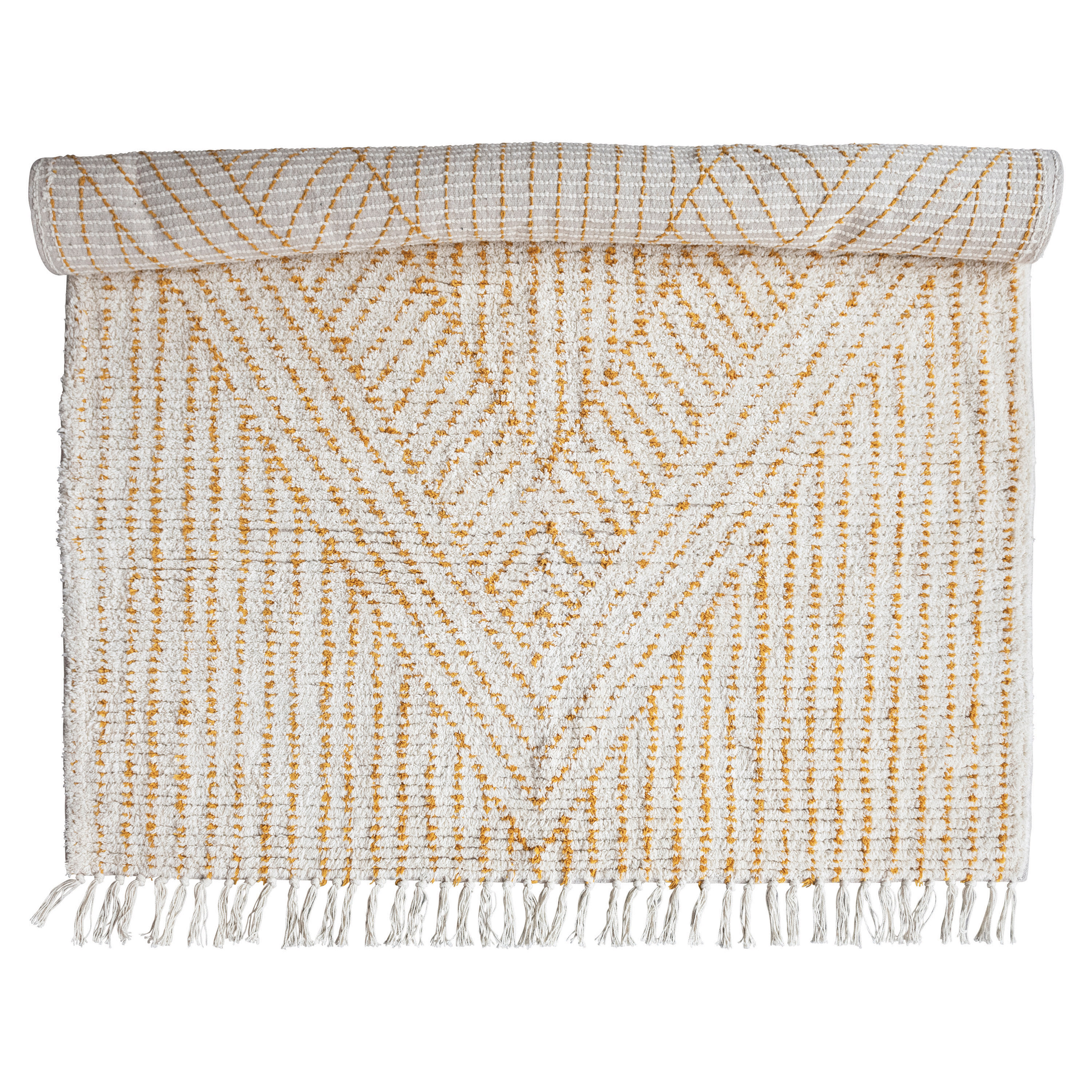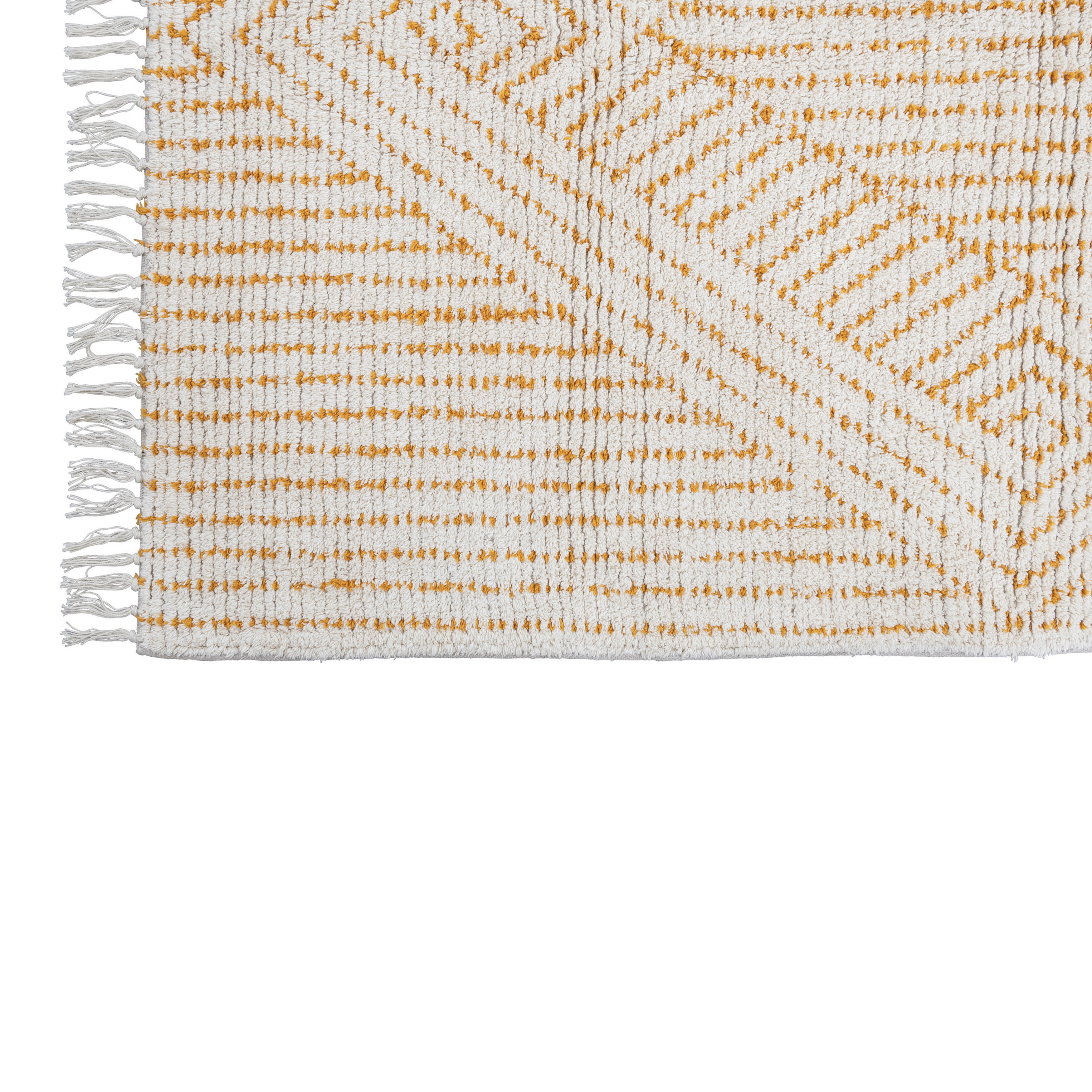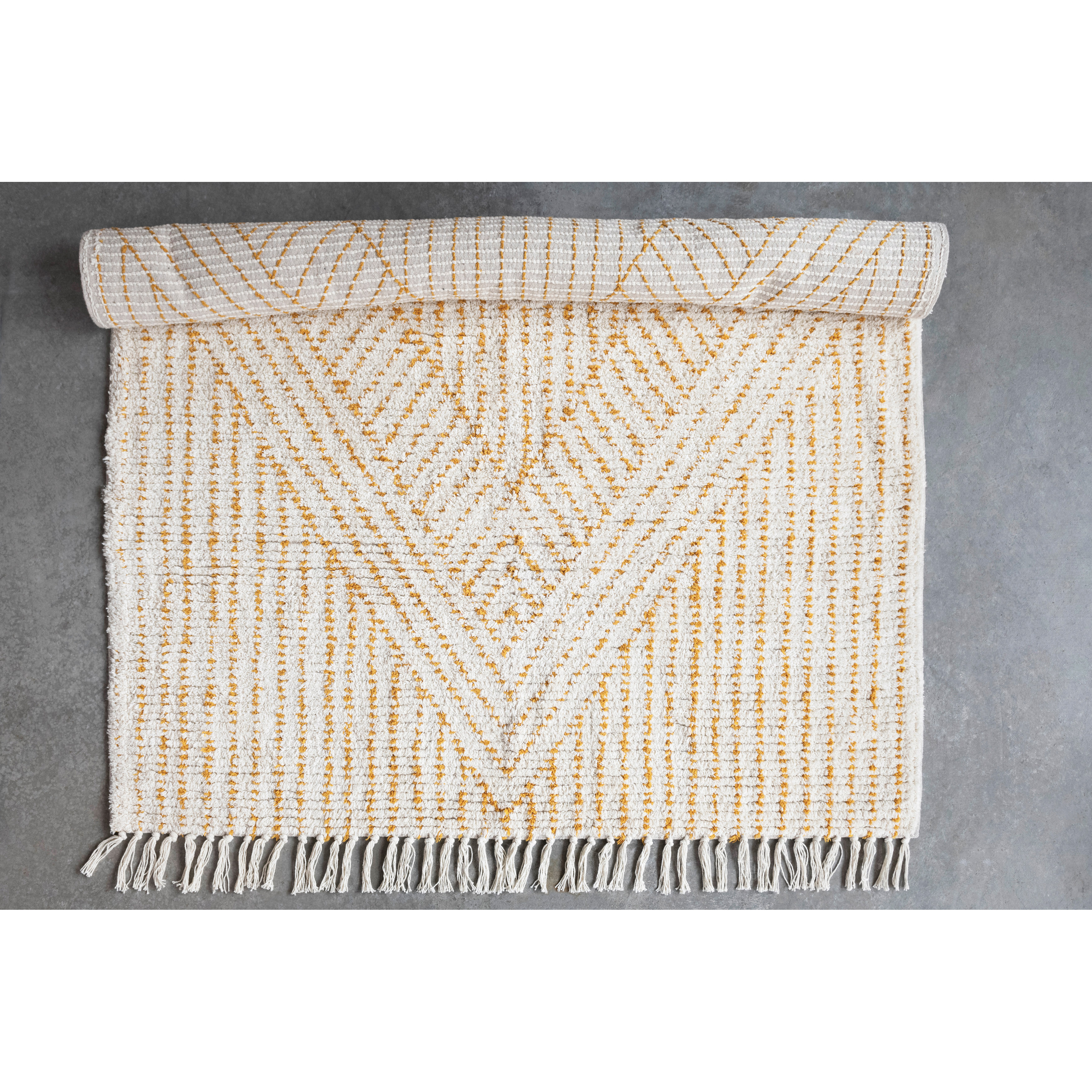 Catalog Name: 4' x 6' Stonewashed Cotton Tufted Rug w/ Diamond, Stripes & Fringe, Ivory & Mustard Color