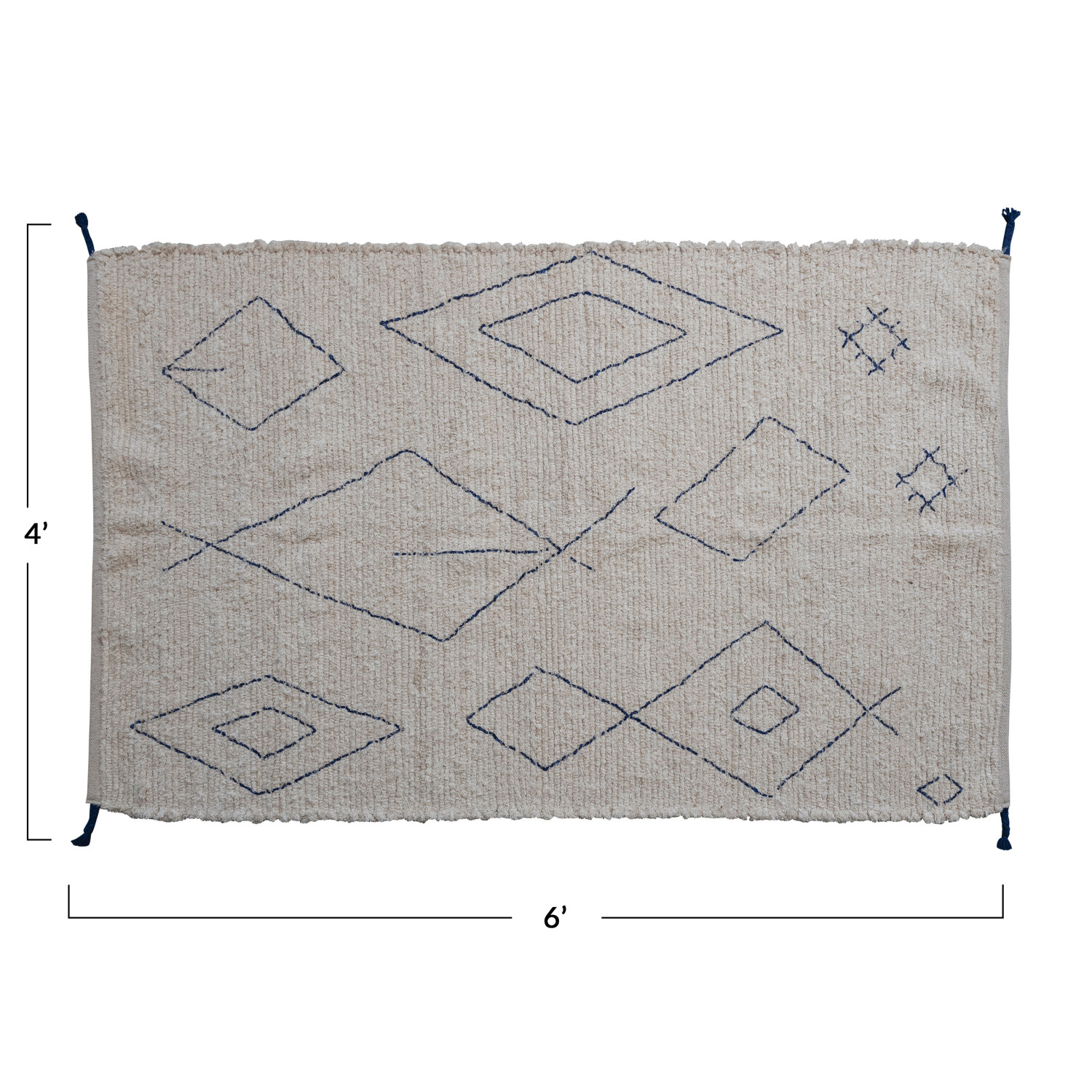 Cotton Tufted Rug w/ Moroccan Design & Braided Tassels, Natural & Blue