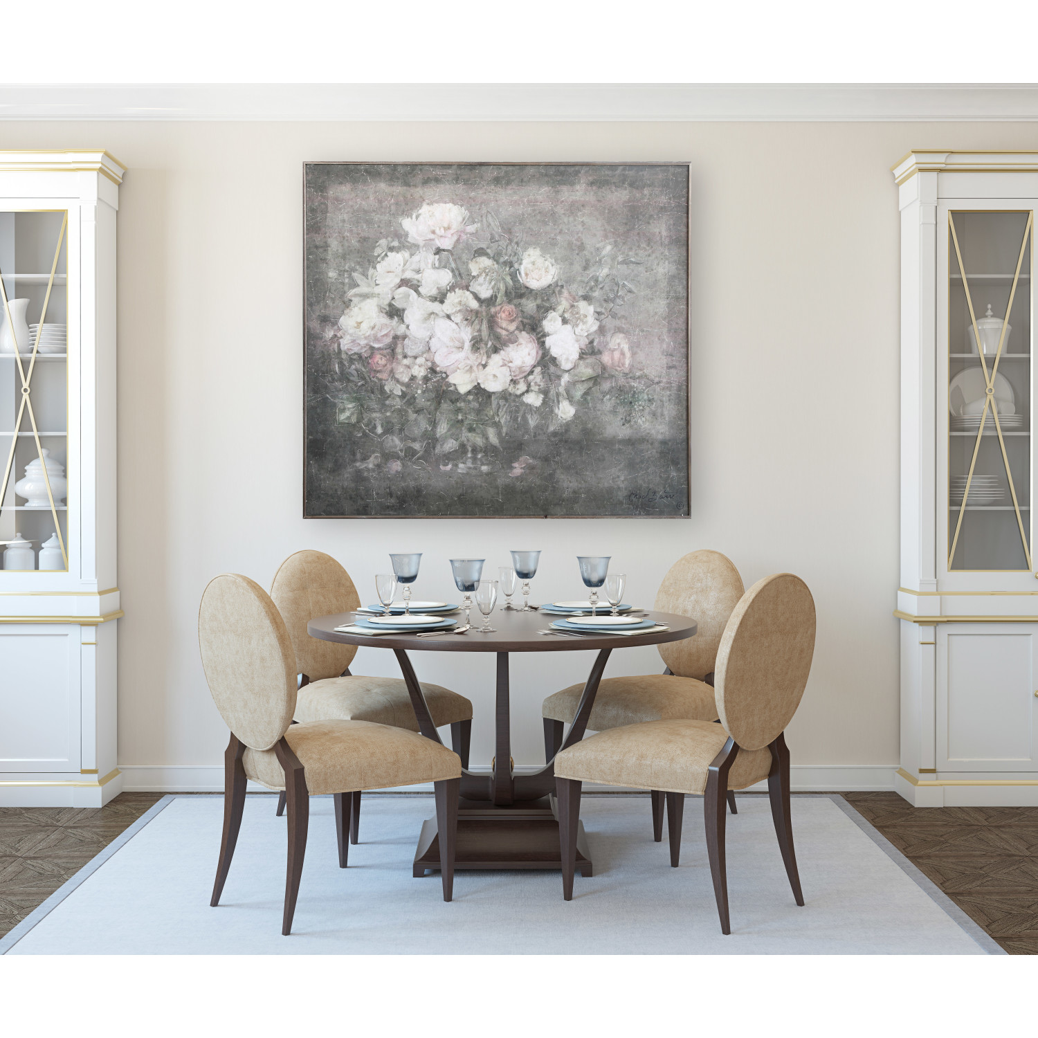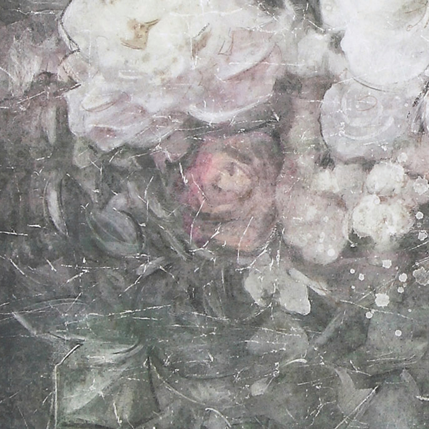 The soft grey and muted pink colors in this bouquet make it a piece for the elegant home decor. White flowers and greyish green leaves all blend in with the distressed finish. It adds a calming and quiet demeanor to the atmosphere.