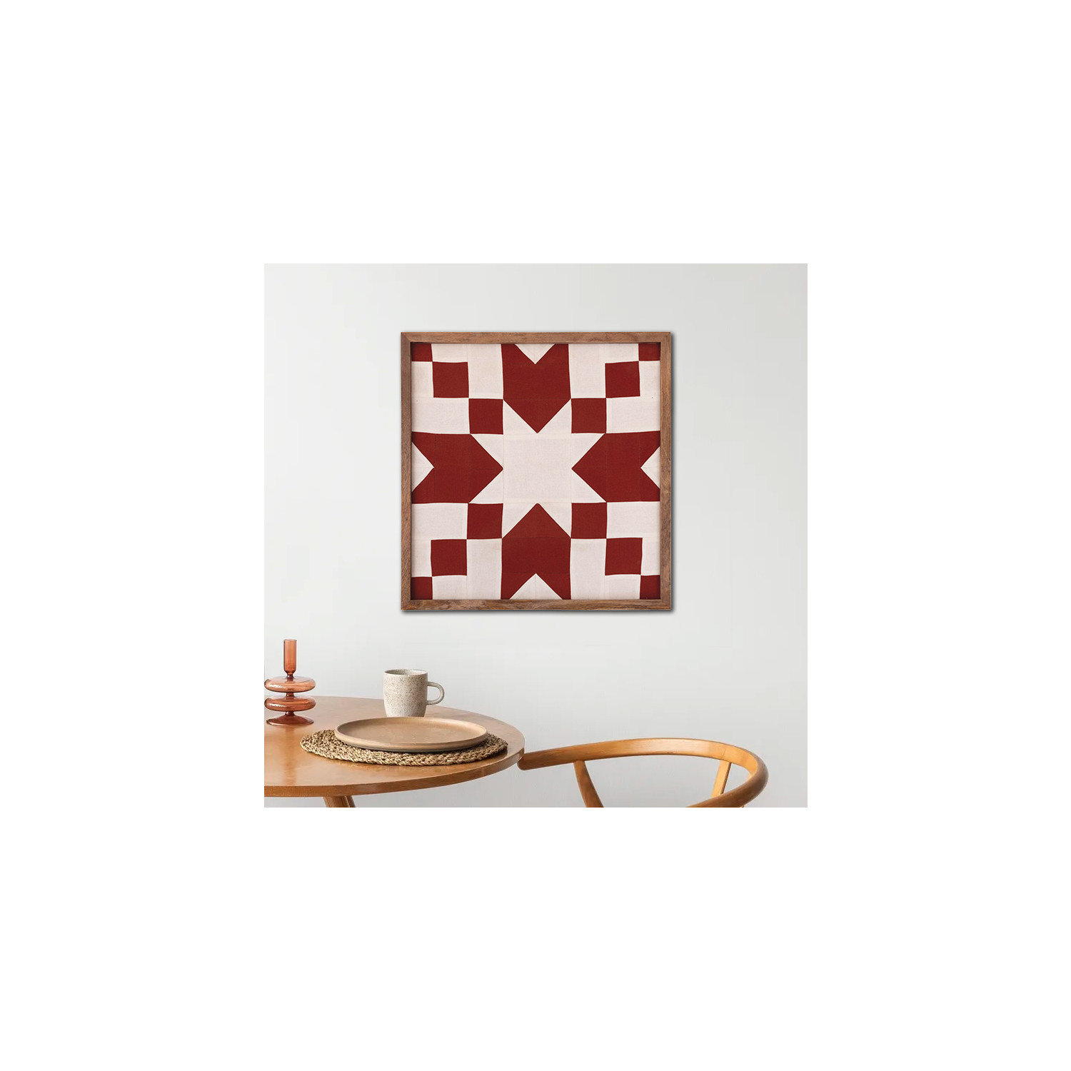 This southwestern-inspired wall art showcases a geometric cotton patchwork design encased in a naturally finished wood frame. Red and cream cotton patchwork wall art in wood frame. Dry clean only. Made from cotton, mango wood, and sustainable MDF.
