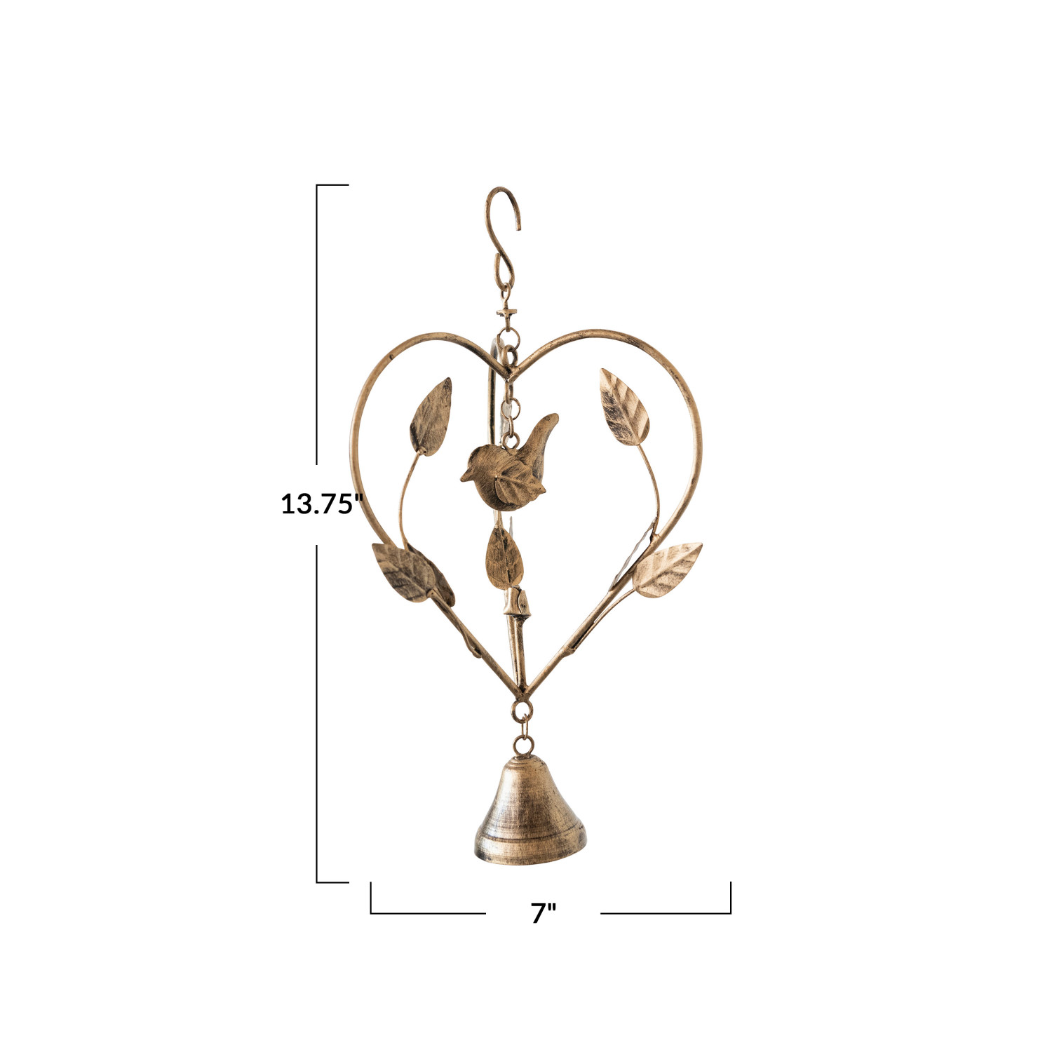 Add some charm and elegance to any space with this hanging metal heart shaped decor. This beautiful accessory features a lovely bird perched on top of a metal heart that has a tinkling bell at the bottom. The heart is adorned with a cascade of green leaves that create a natural and fresh look. The metal material has an antique gold finish that gives it a rustic and elegant touch. The decor has a convenient hanging mechanism that allows it to be hung vertically on any wall or door. It measures 7 inches round and 13.75 inches high, making it a generous size for any space. This hanging metal heart shaped decor is a perfect accent for any farmhouse, French country, boho, garden, or vintage style home. It can be used to add some charm and elegance to any room with its beautiful design and quality material.