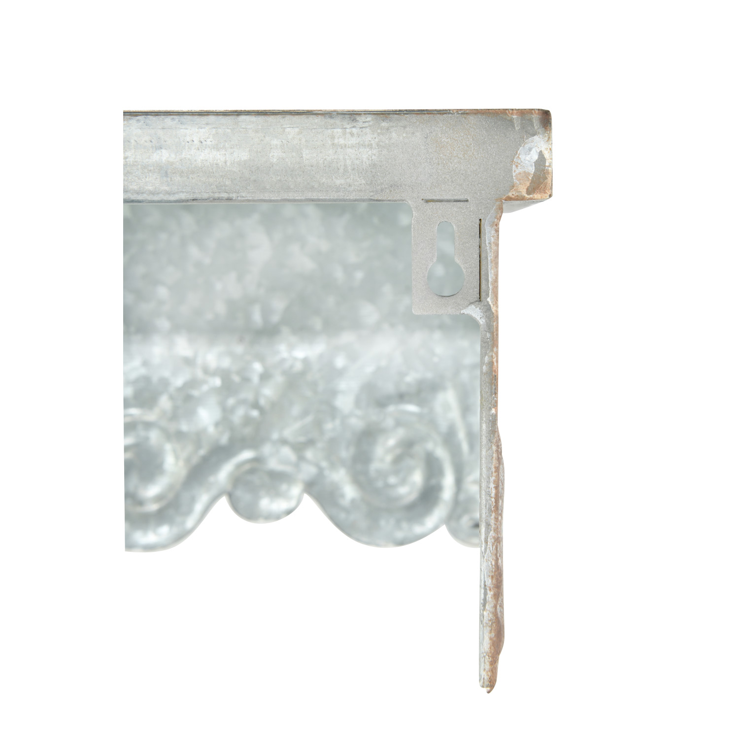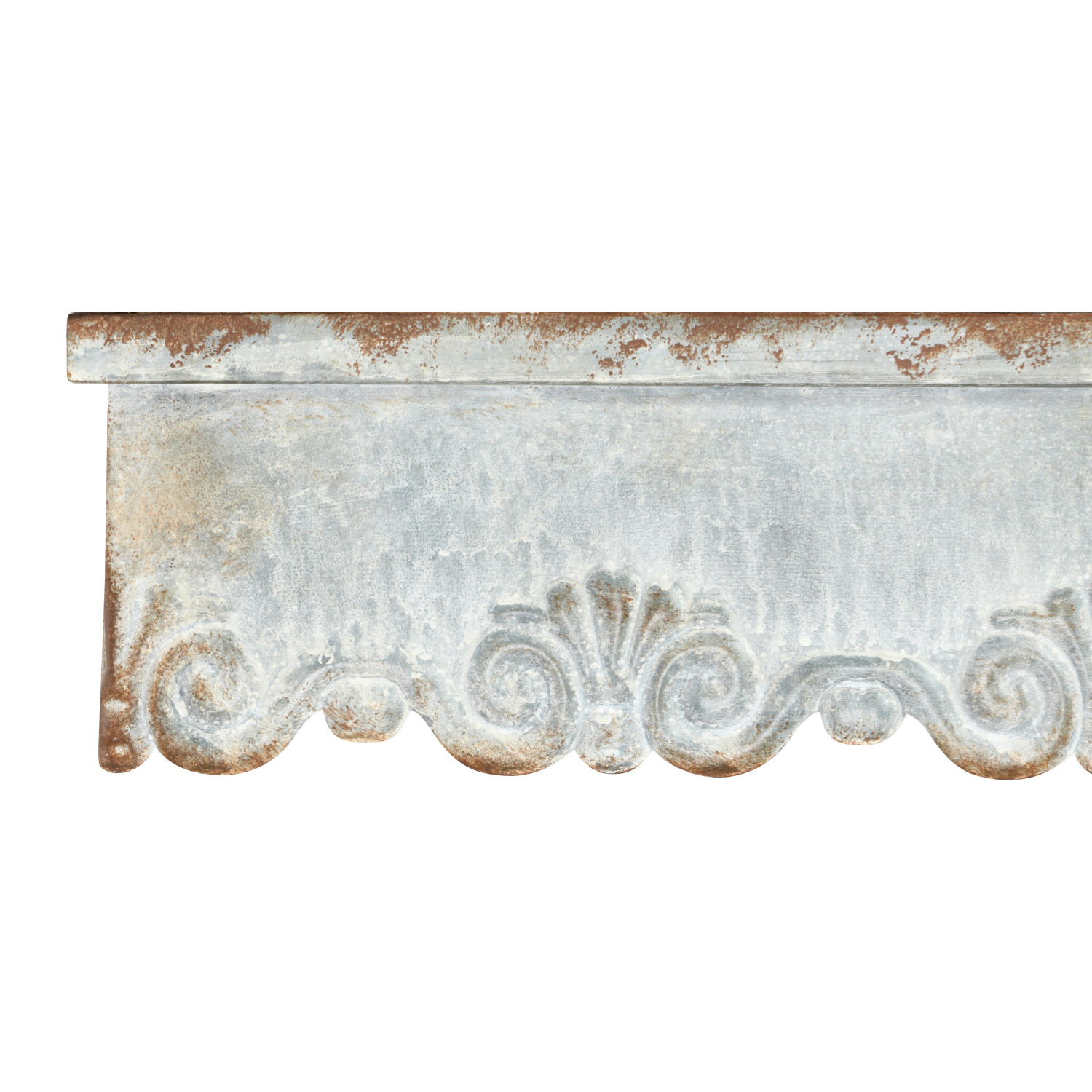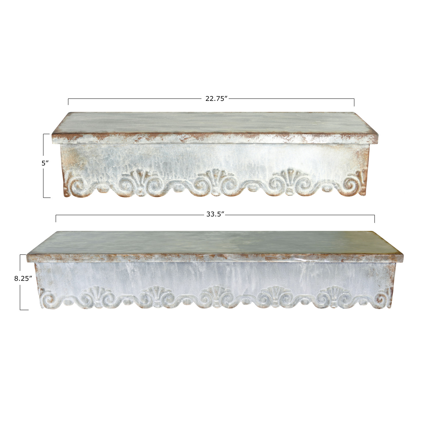 Catalog Name: 33-1/2"W x 8-1/4"D x 5-1/2"H & 23"W x 6"D x 5-1/4"H Metal Wall Shelves w/ Scalloped Edge, Distressed Zinc Finish, Set of 2