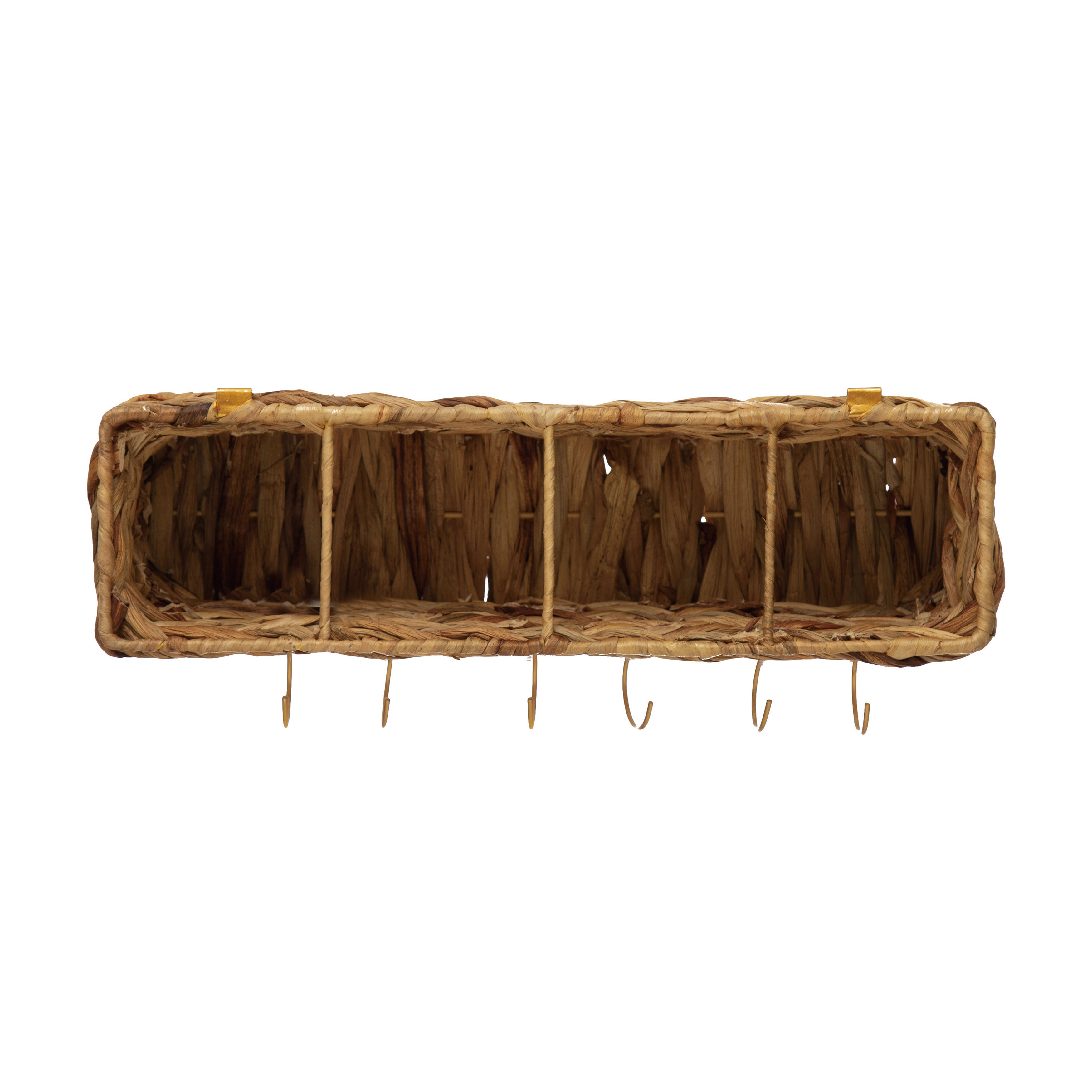 Catalog Name: 16"W x 4-3/4"D x 8-1/2"H Hand-Woven Straw & Metal Wall Basket w/ 4 Sections & 6 Hooks, Natural & Brass Finish